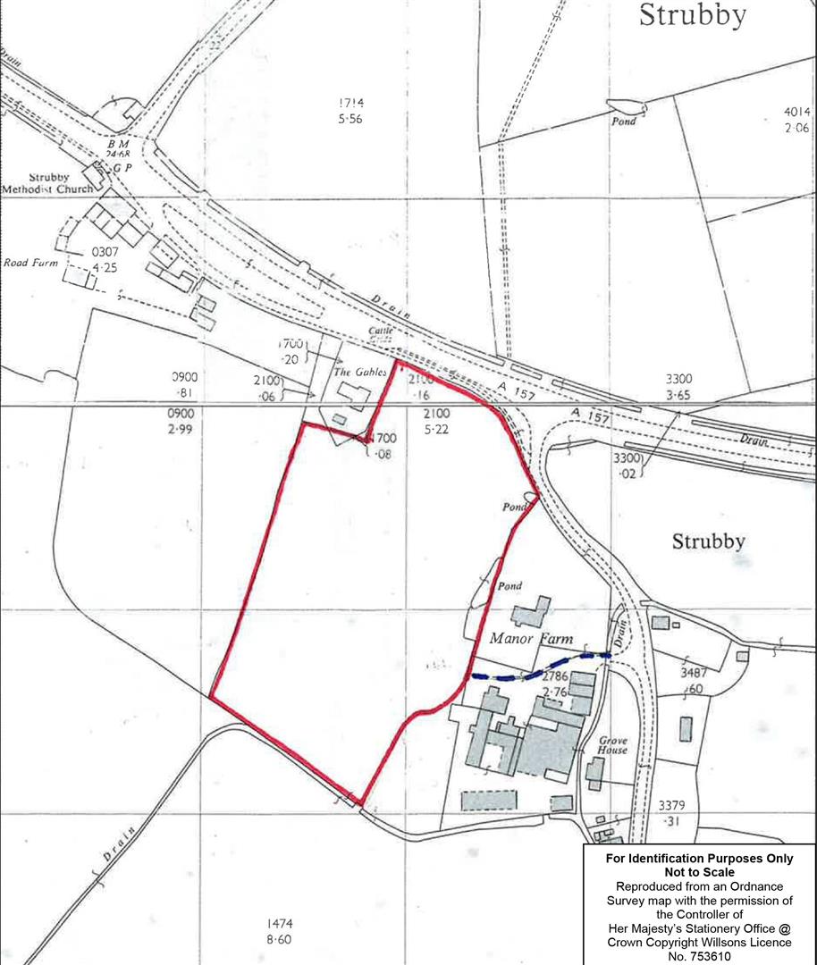 The land can be described as TF4581. OS Number: 2100pt. – 5.00 acres (2.02 ha). The land is situated with road frontage to the main A157 road at Strubby mid-way between Maltby le Marsh and Withern. Access to the land is via a metal gate just off the main highway on the north-eastern boundary, there is a further access into the land via a right of way as shown as a blue dotted line on the plan.