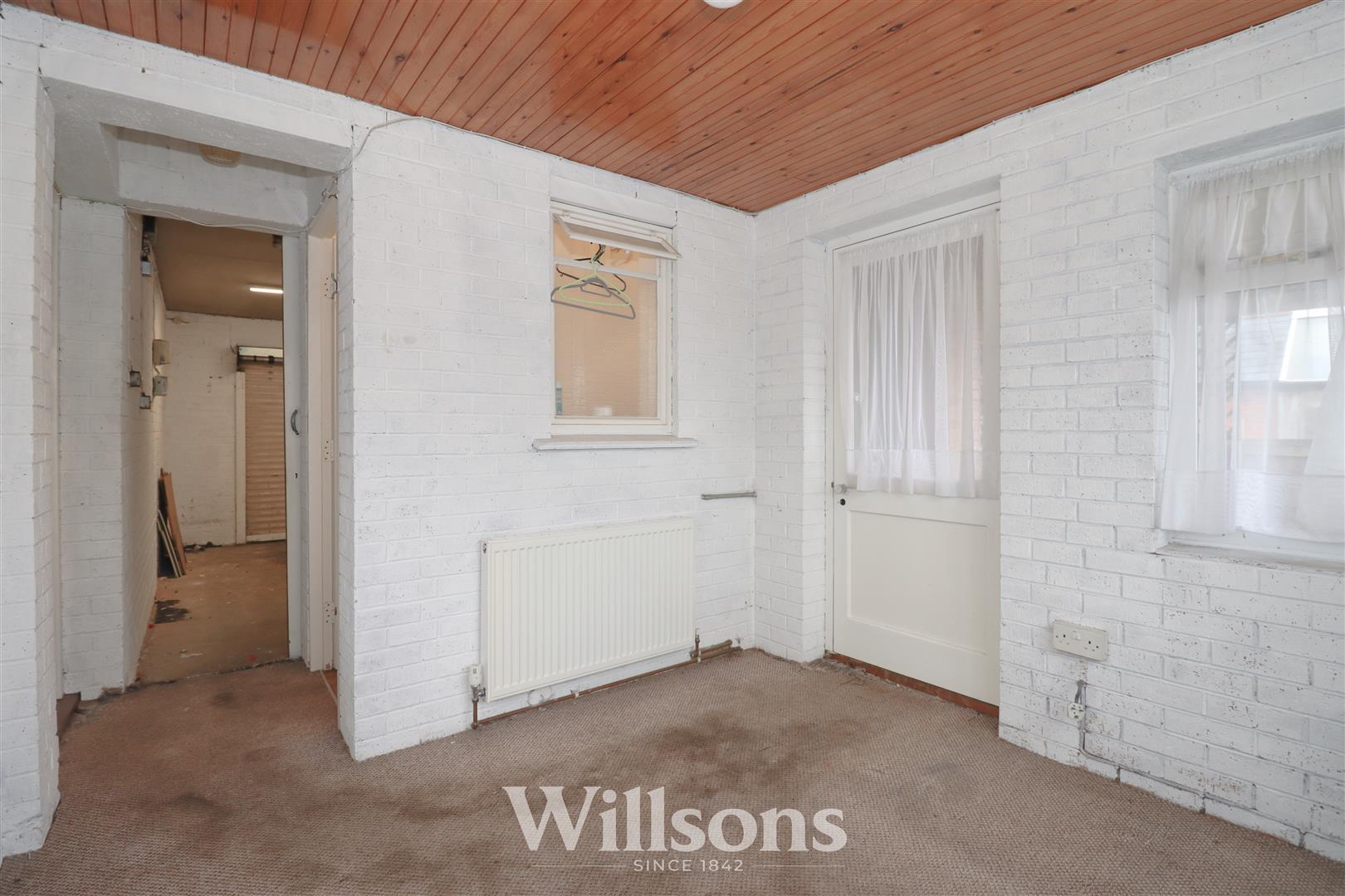 With radiator, carpeted flooring, windows to three sides and wooden external door to the rear garden.