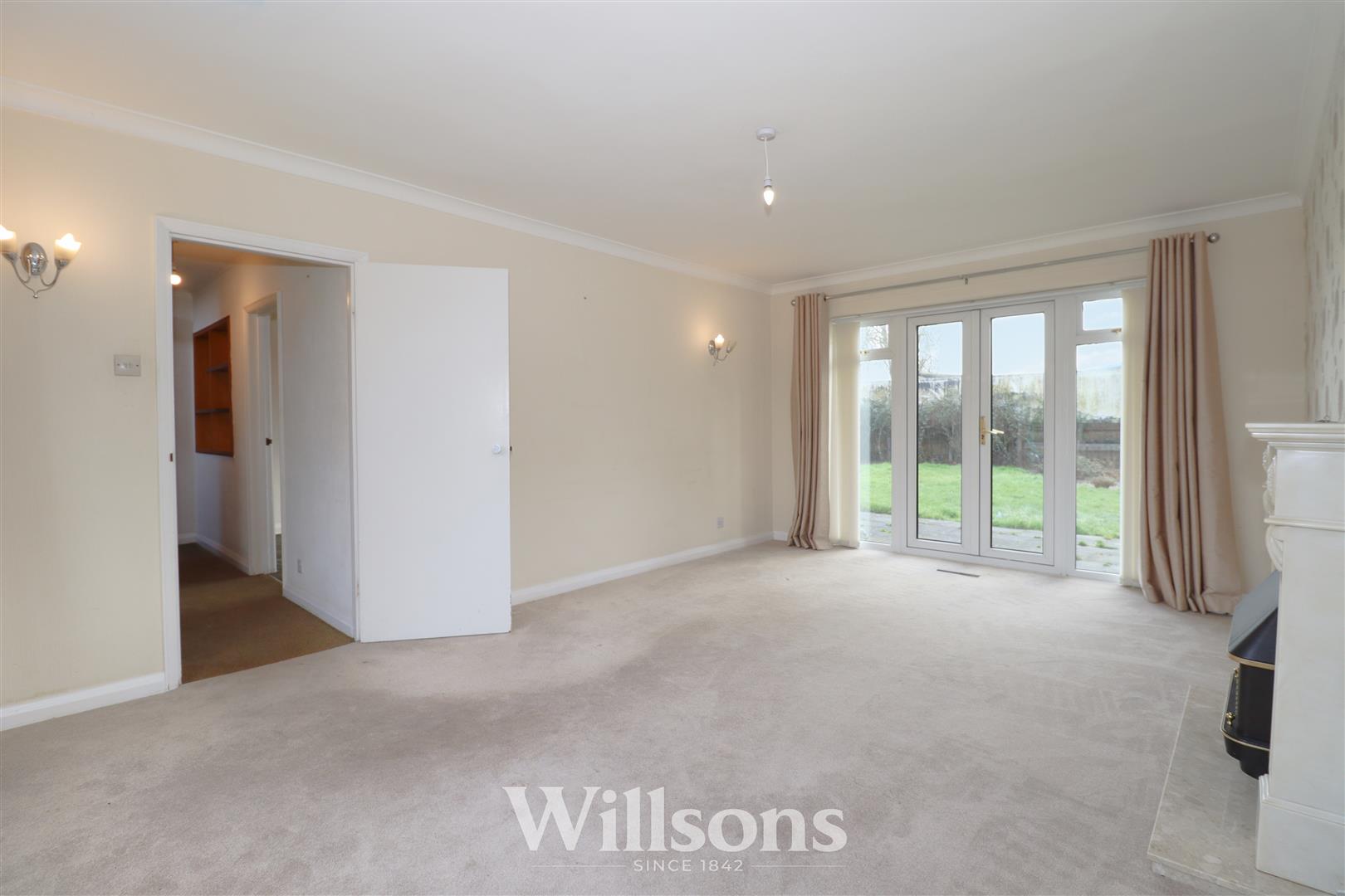 Triple aspect room extending the full depth of the property with central gas fire, hearth and mantle, wall lighting, carpeted flooring, French doors and windows to the garden and further windows to the front and side of the property.