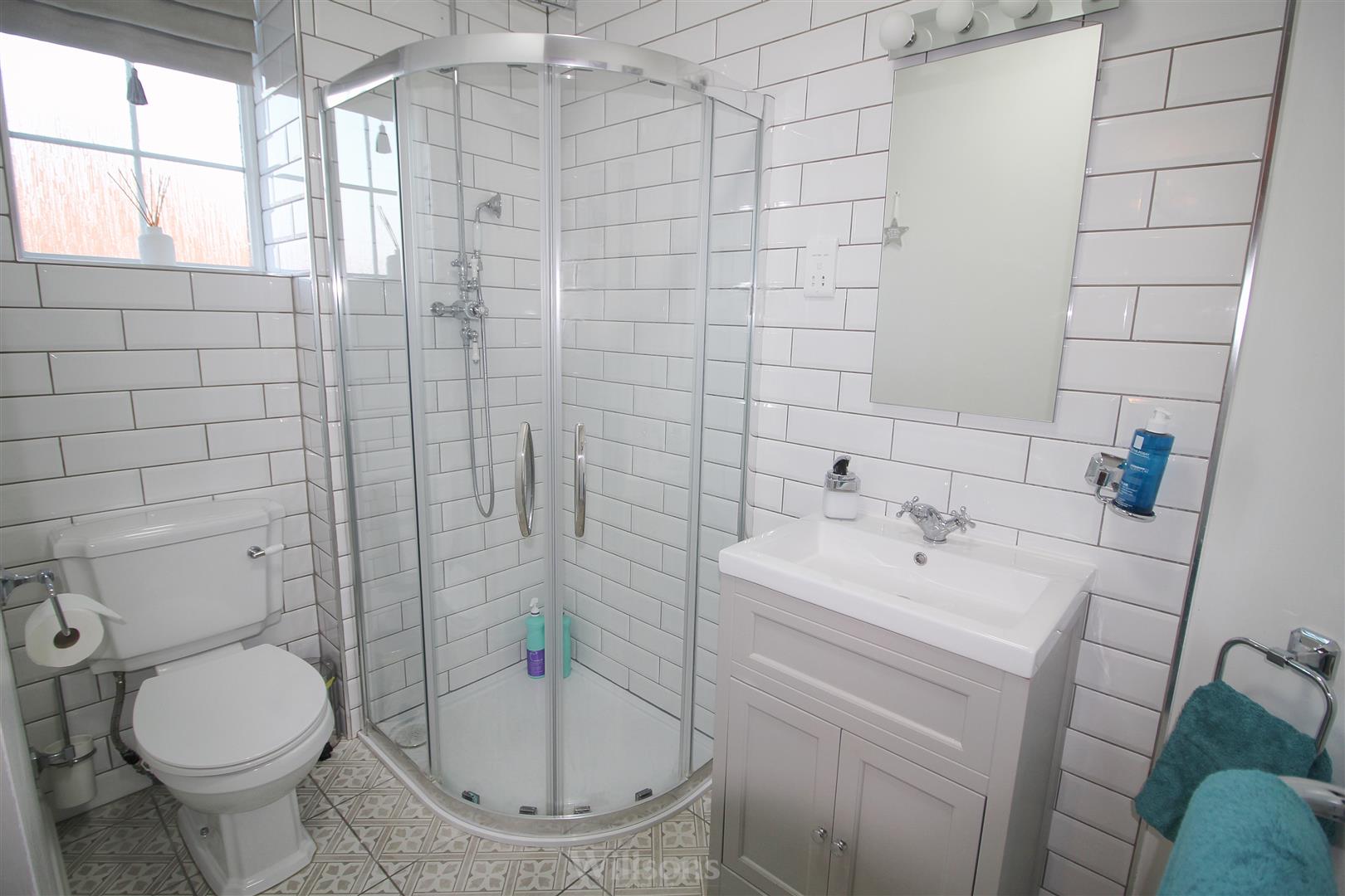 With enclosed corner shower cubicle having direct feed waterfall and handheld head, WC, sink with vanity unit, part tiled walls, extractor fan, period style heated towel rail, tiled flooring and window to the rear of the property.