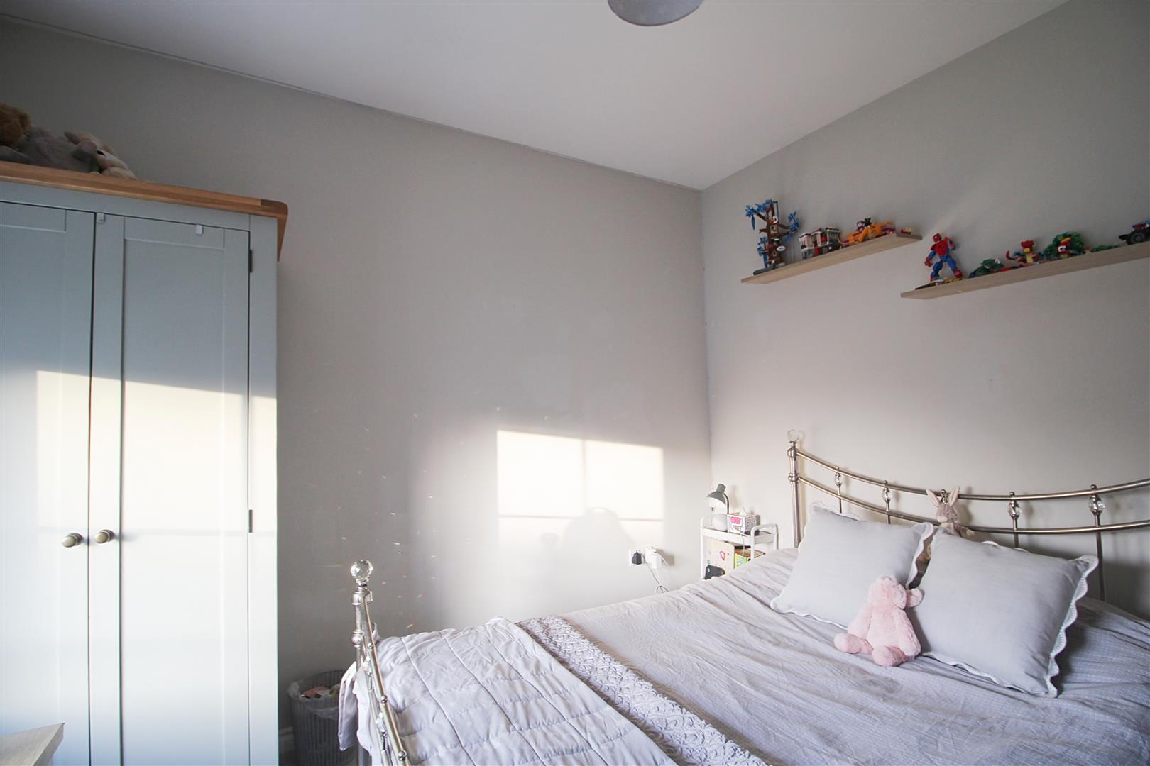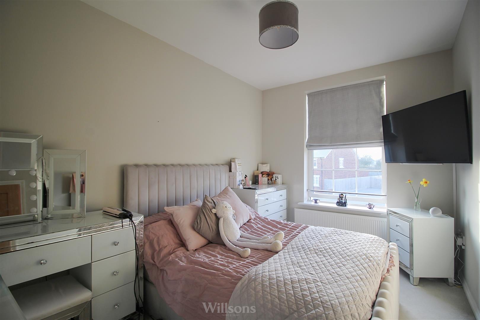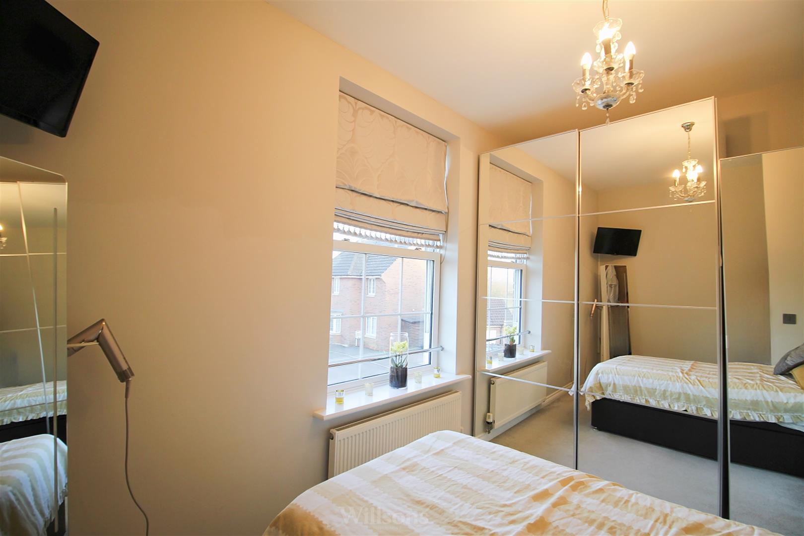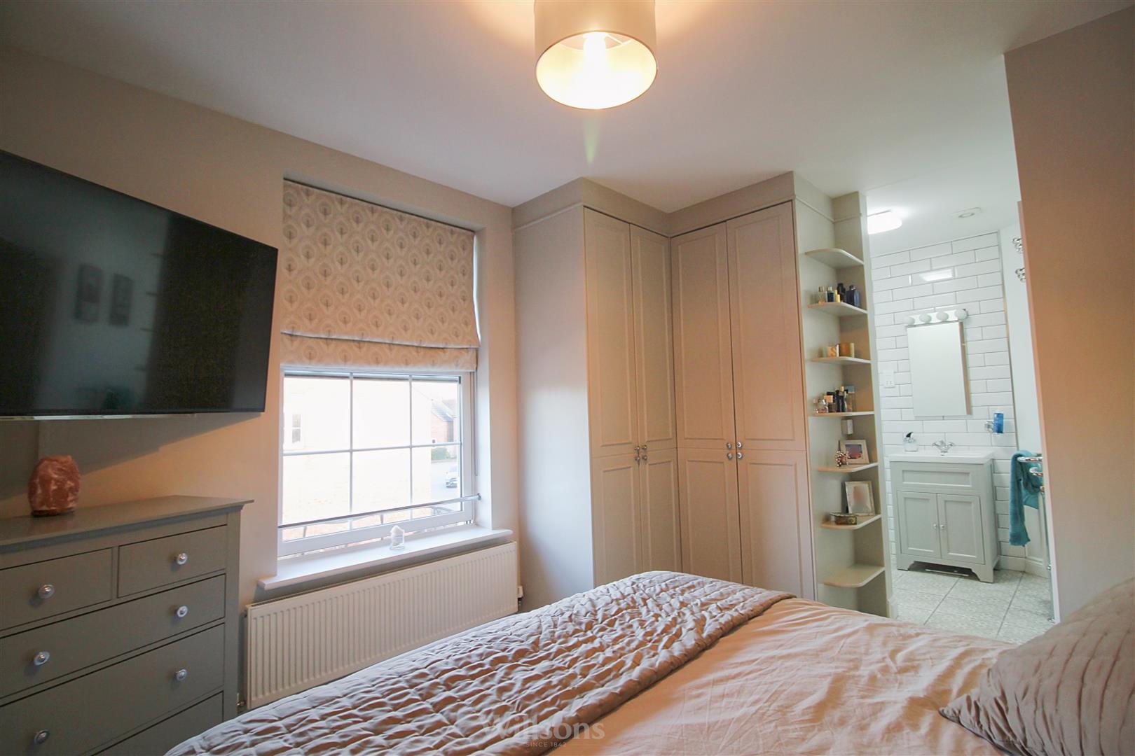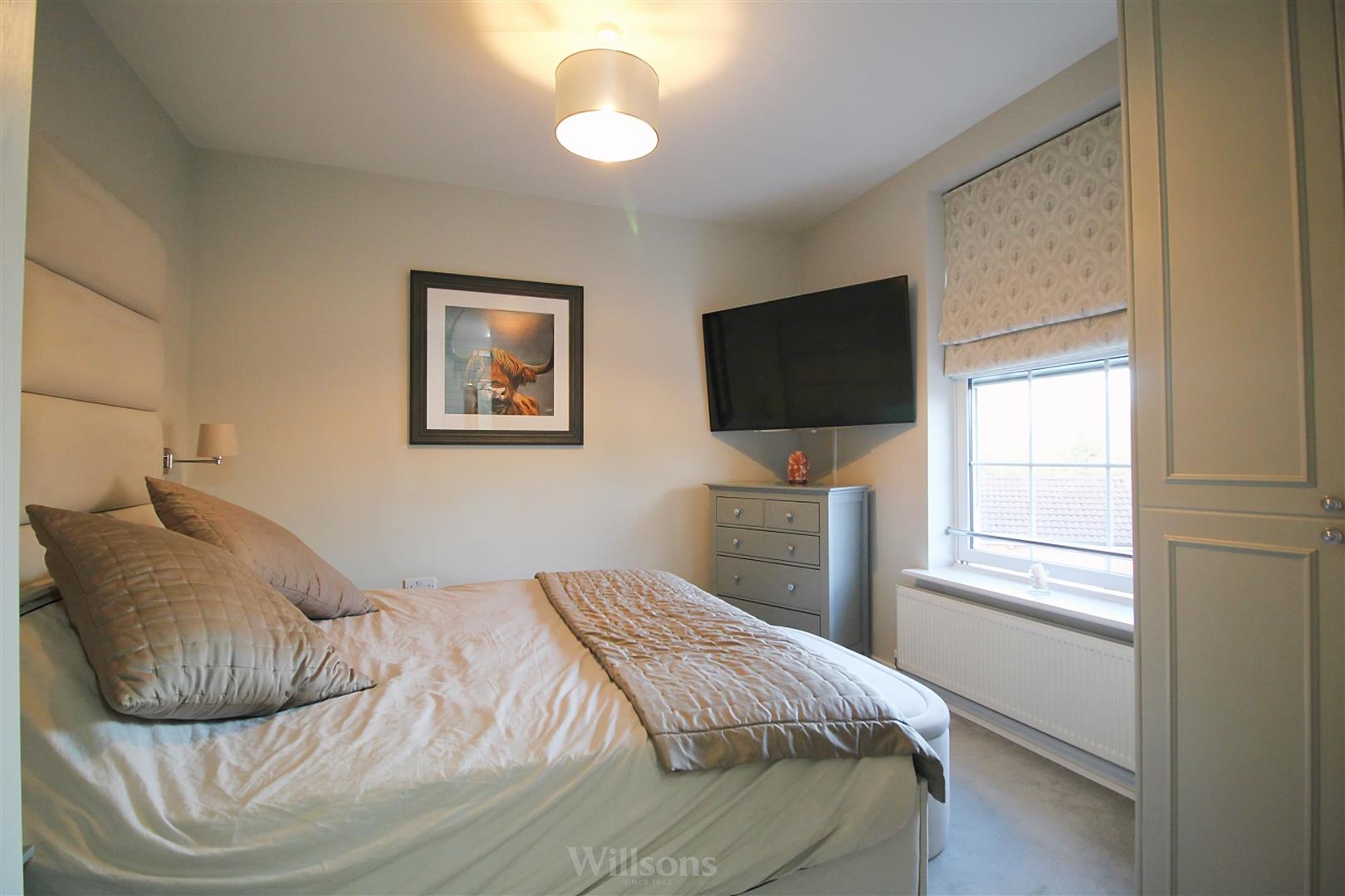 With fitted super king bed, fitted corner wardrobes, bedside wall lights, carpeted flooring and sash window to the rear of the property.