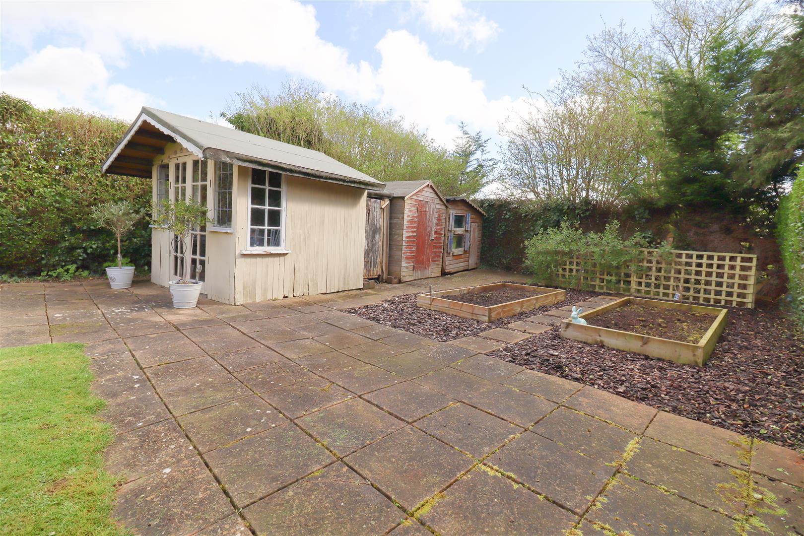 Set to lawn with hedged borders, raised concrete slabbed patio area and an additional concrete slabbed patio area outside the annex. concrete pathways, raised vegetable borders, outbuildings and summer house with power supply.