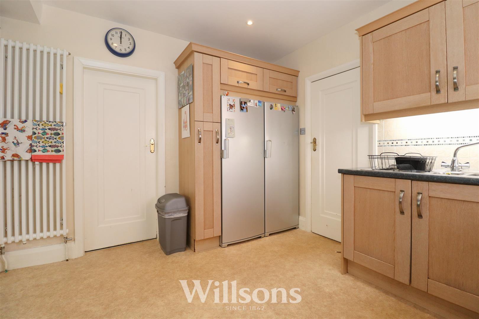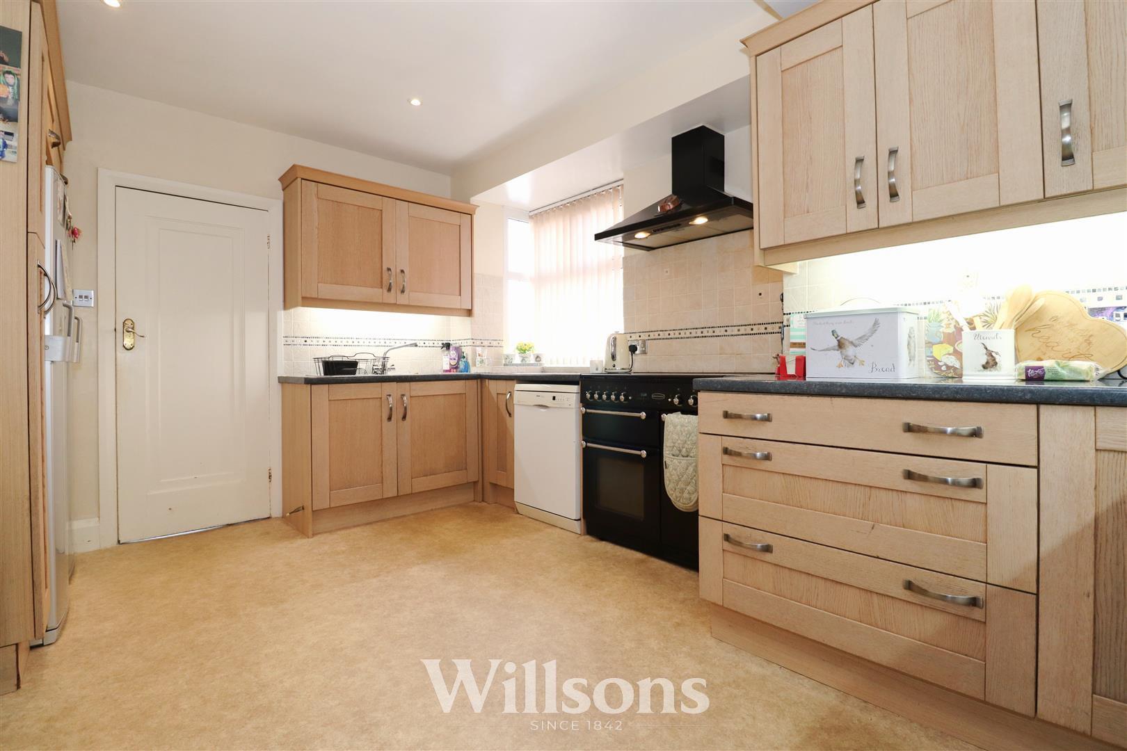 With wall and base units, part-tiled walls, sink with 1.5 bowls, drainer and mixer tap, space and plumbing for dishwasher and washing machine, range cooker with extractor over, space for full height fridge and freezer, radiator, downlighters, under-unit lighting to wall units, window to the left hand side of the property and vinyl flooring.