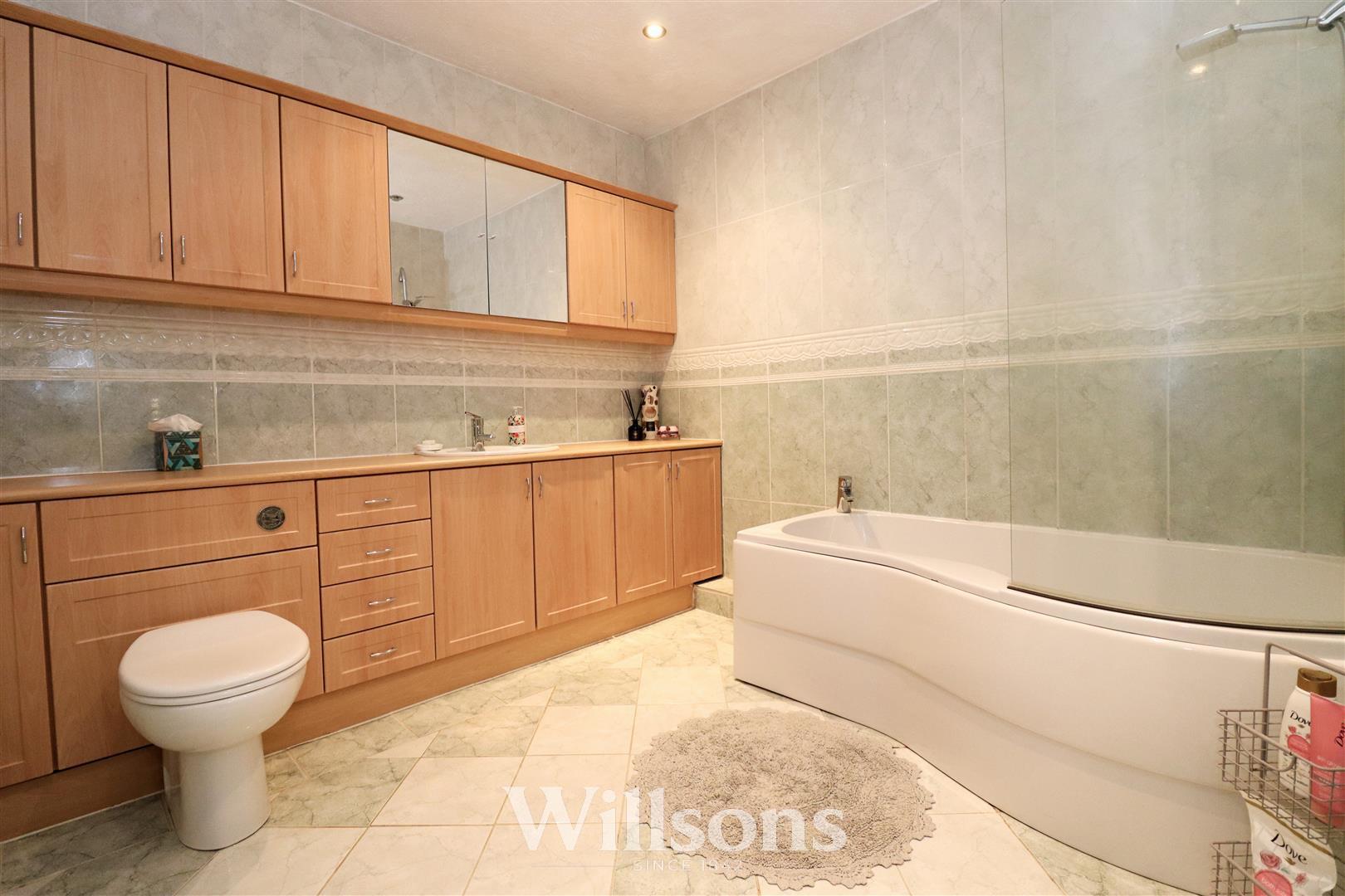 With fully tiled walls, “P” shaped bath with direct feed shower over, WC and sink built-in vanity with storage, wall units, downlighters, extractor fan, chrome heated towel rail and tiled flooring.
