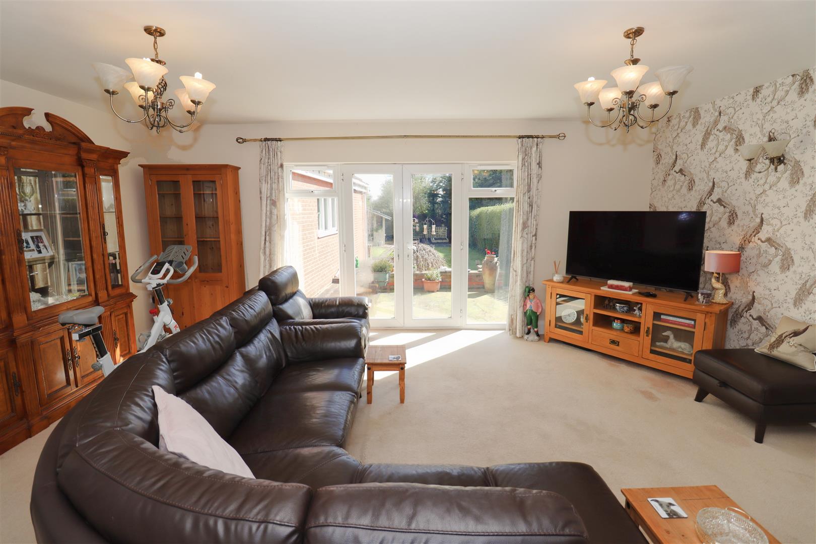 “L”-shaped room with fireplace and gas fire, telephone and television points, radiator, uPVC French doors with glazed side panels leading onto the patio, external door leading to the utility lean-to and carpeted flooring.