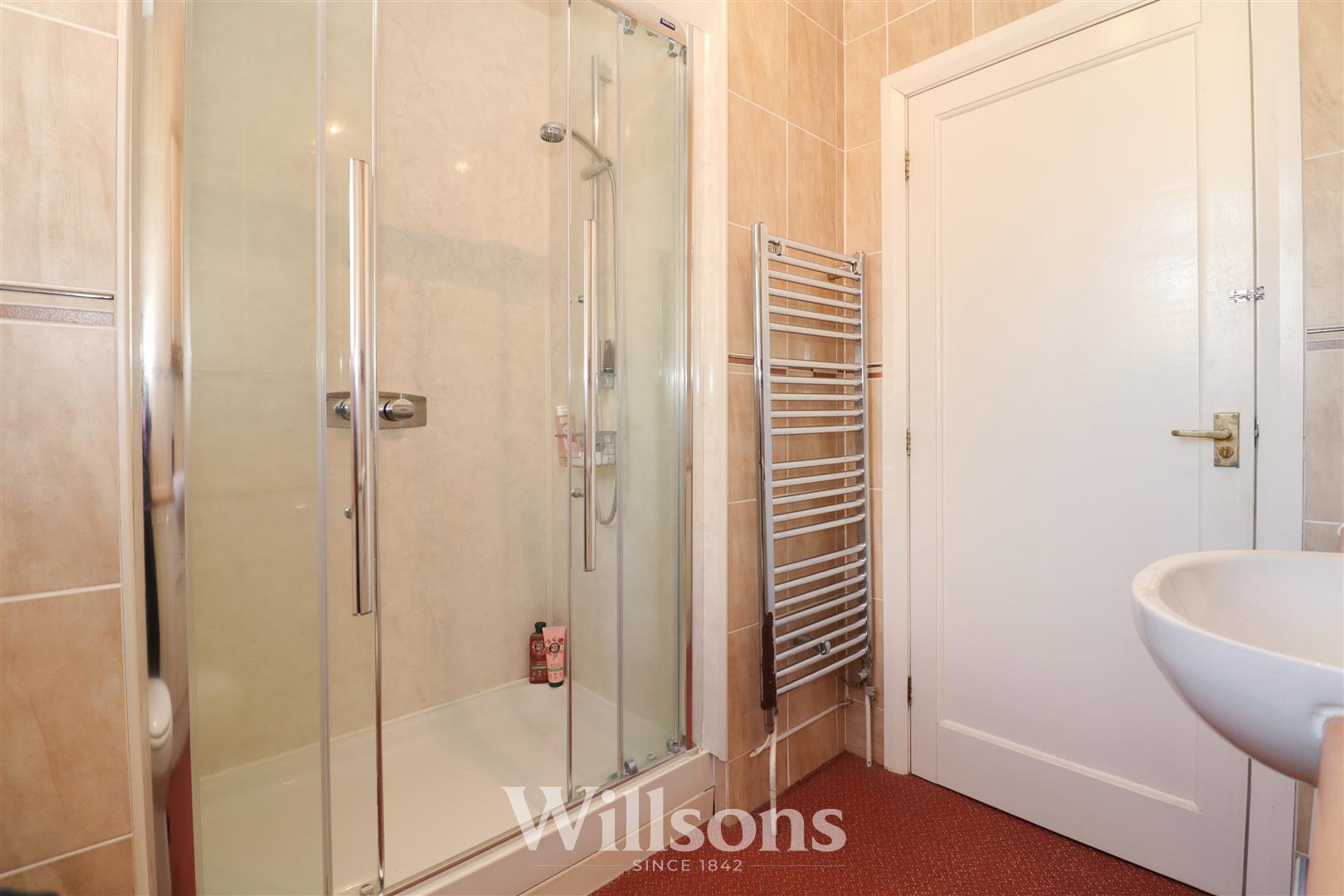 With recessed shower cubicle (0.7m by 1.15m), shower boarding walls and direct feed shower, extractor fan, heated towel rail, WC and wash basin built-in vanity with storage, tiled walls, window to the left hand side of the property and carpeted flooring.
