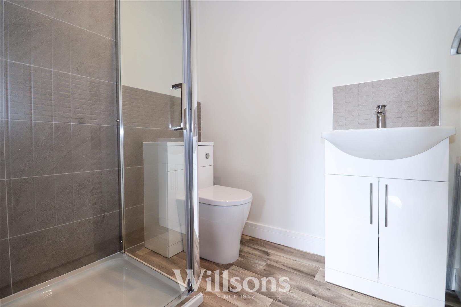 Comprising concealed cistern WC unit, washbasin vanity unit with mixer tap, tiled splashback and storage below, heated towel radiator, downlighting, extractor fan, property fuse box, high-level window with obscure glazing and vinyl flooring.