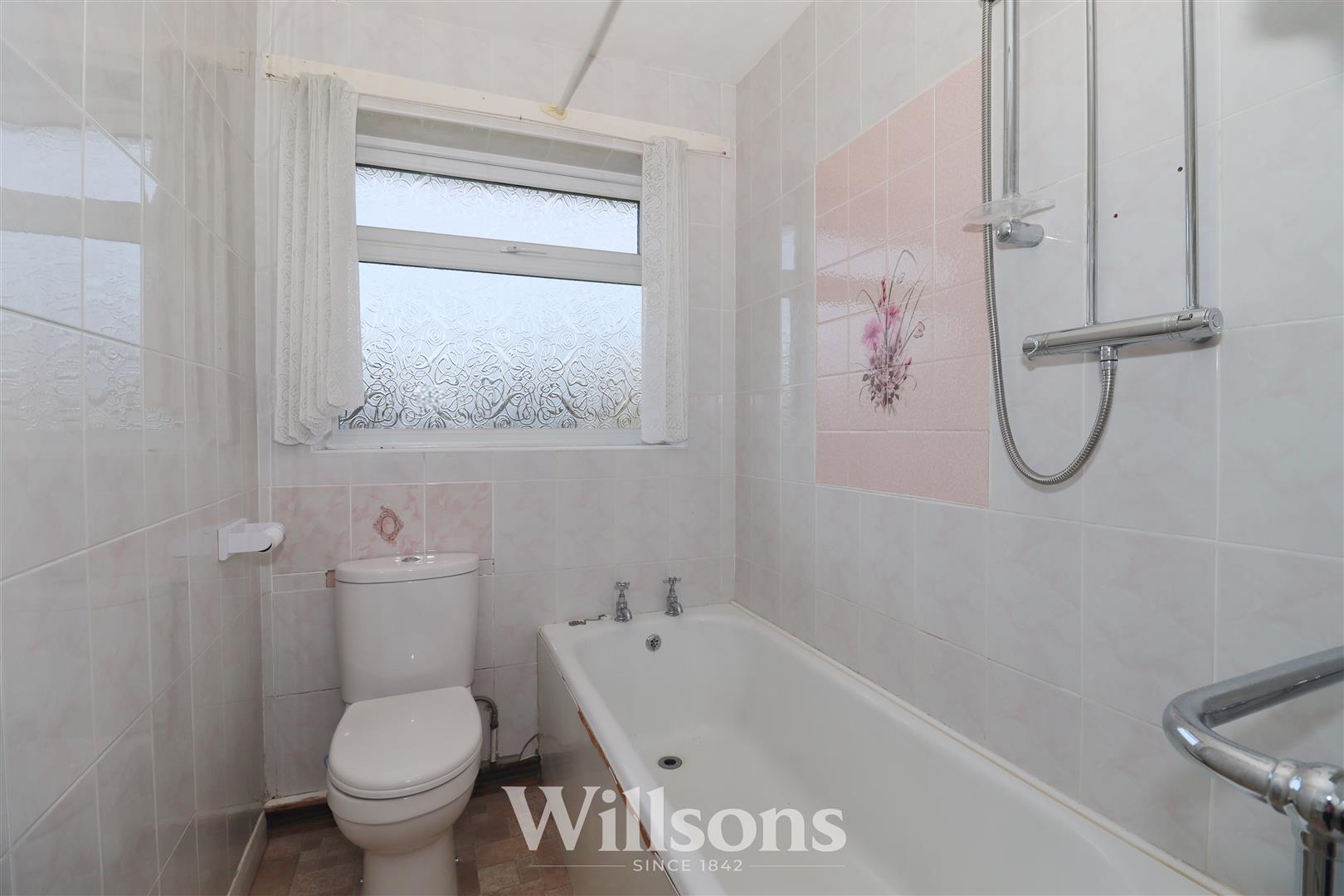 Bath with shower over, WC, wash basin, towel radiator, extractor fan, tiled walls, vinyl flooring and window with obscure glazing to the rear.