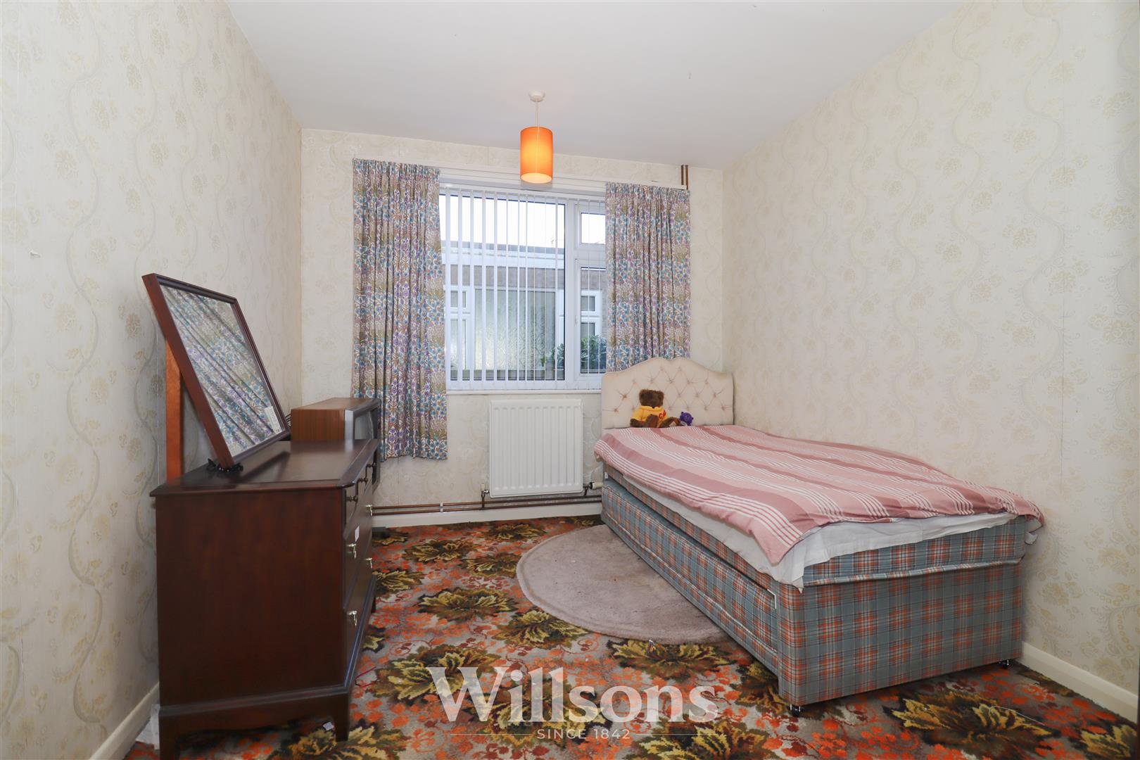 With fitted furniture including wardrobes and draws, wall lighting, radiator, window with views over the rear garden and carpeted flooring.