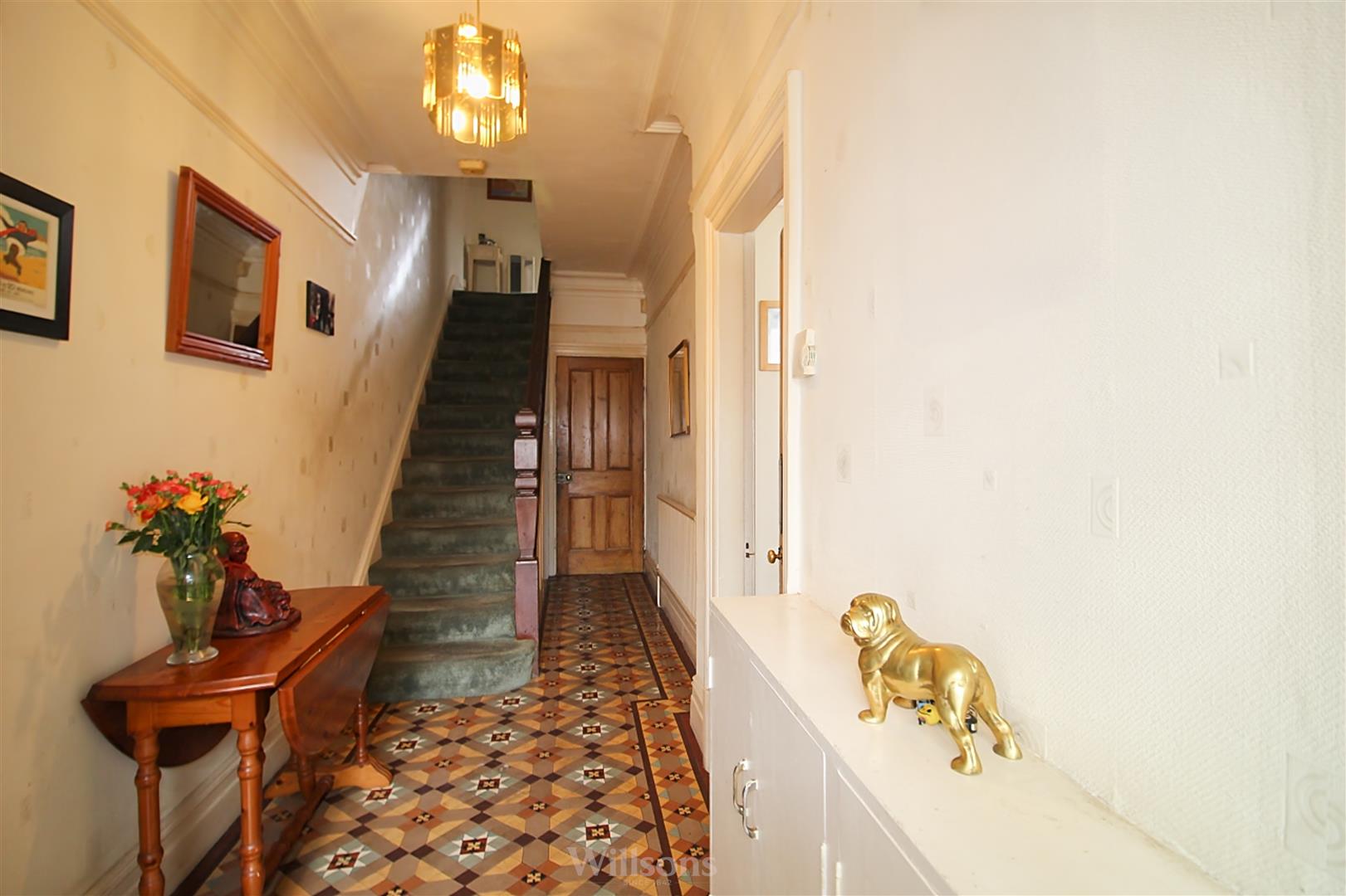 With stained glass and timber frame door leading to the hallway having original tiled flooring (from 1910) and under stairs storage area.