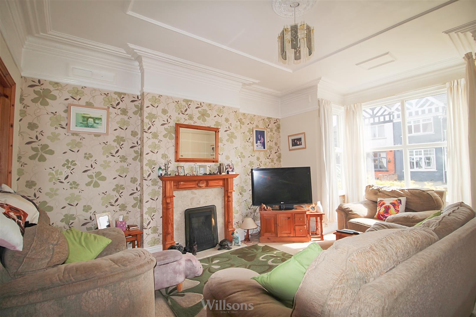 With bay window to the front of property, double frosted glazed and timber doors leading to the dining room, carpeted flooring, wooden surround fireplace with marble effect hearth and gas fire.