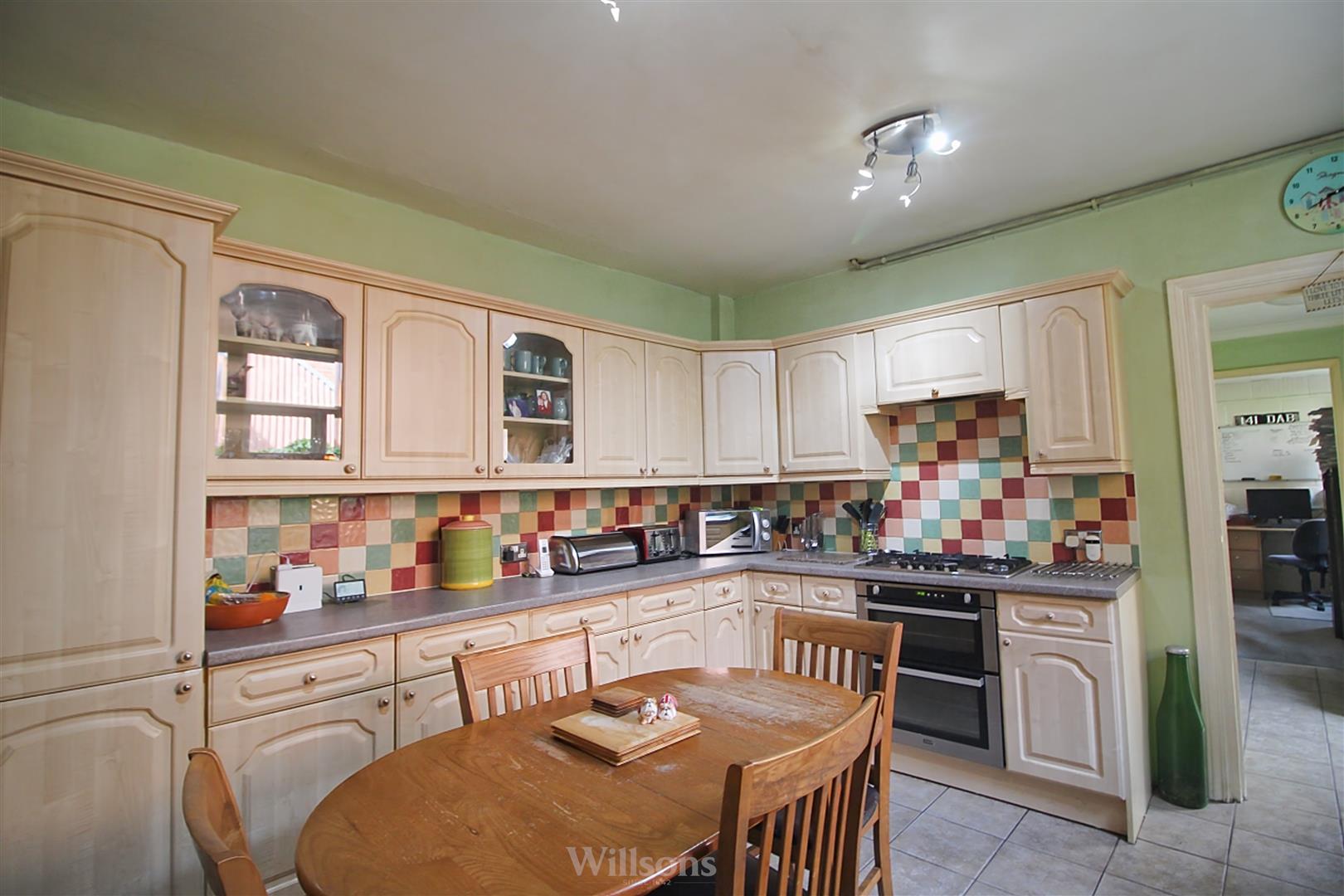 With a range of base and wall units, tiled splashbacks, stainless steel sink with mixer taps, five ring gas hob, concealed extractor hood, dual electric and gas double oven, space and plumbing for dishwasher, Worcester gas fired boiler, tiled flooring and widow to side of the property.