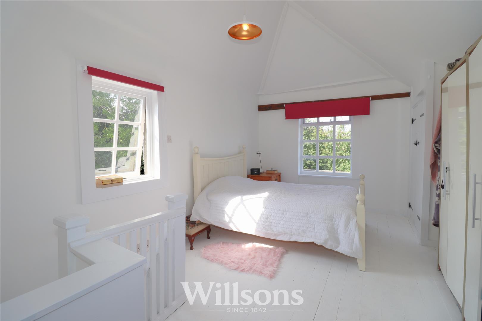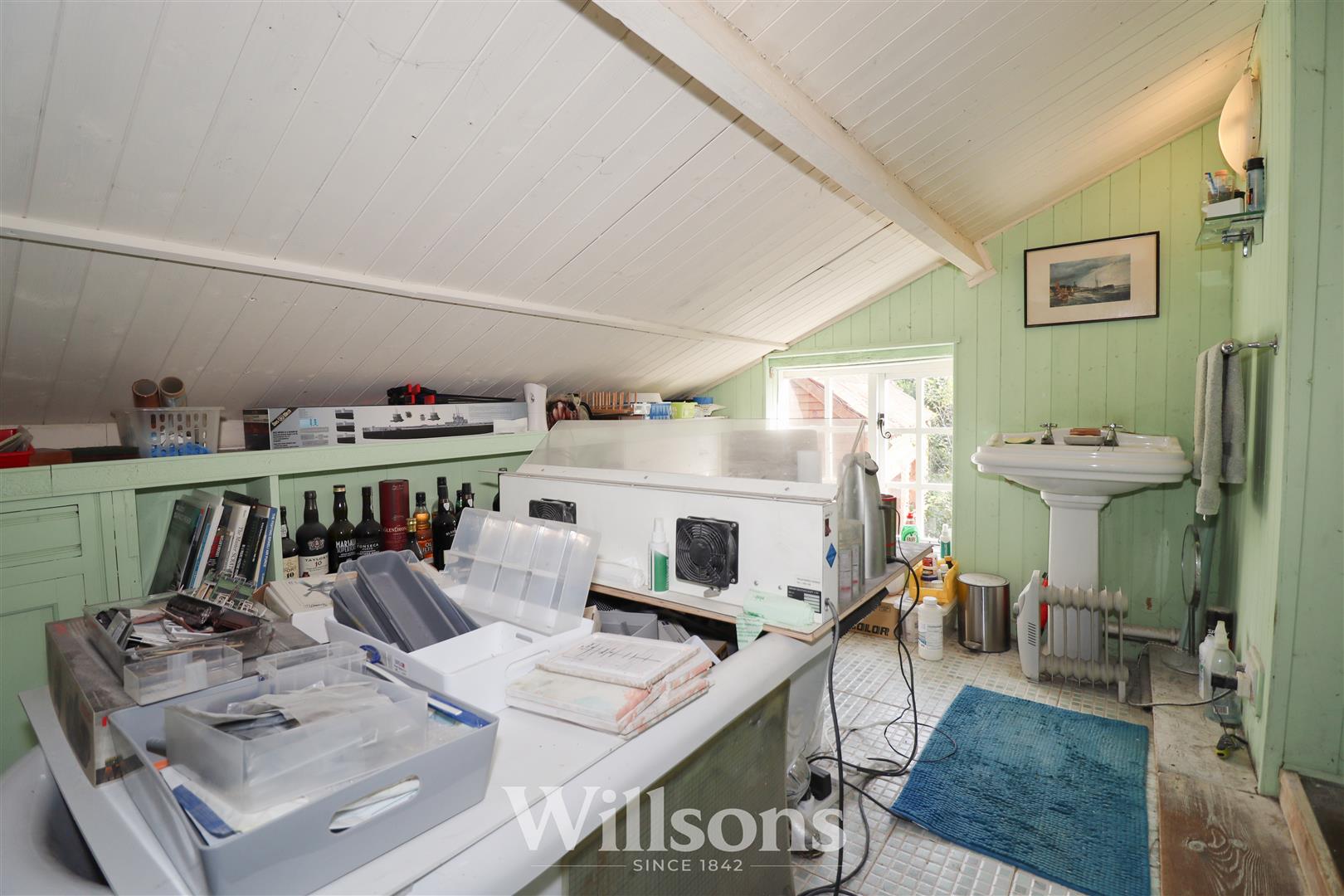 With high vaulted ceilings, WC, sink vanity unit, built-in storage cupboards, electric heater, windows to three aspects and wooden flooring.