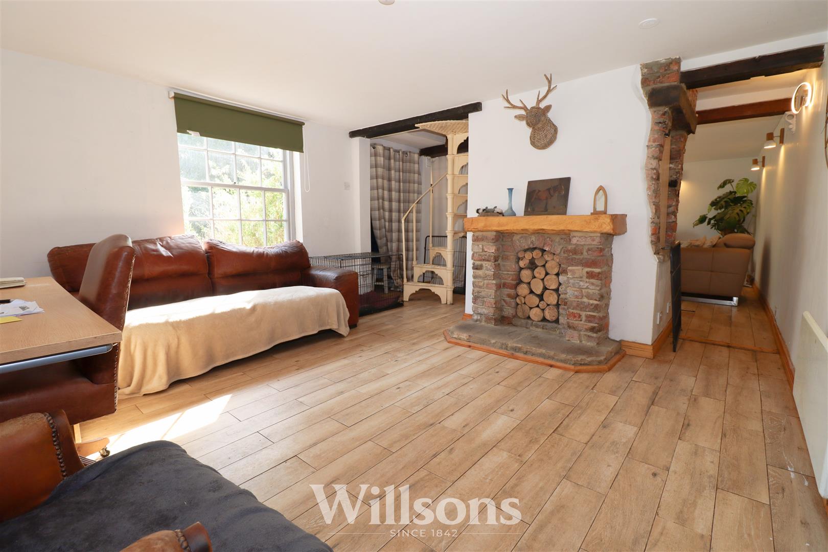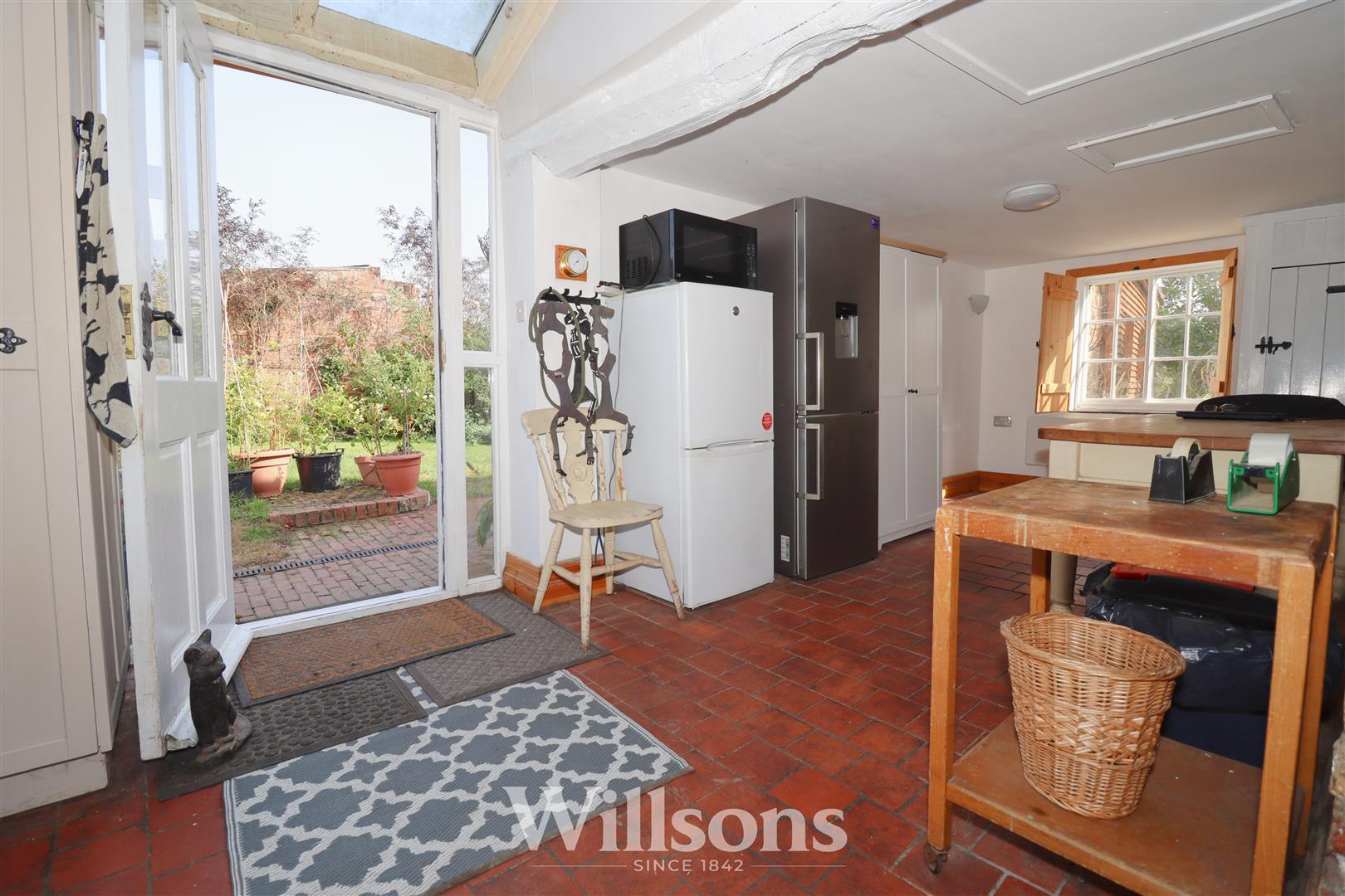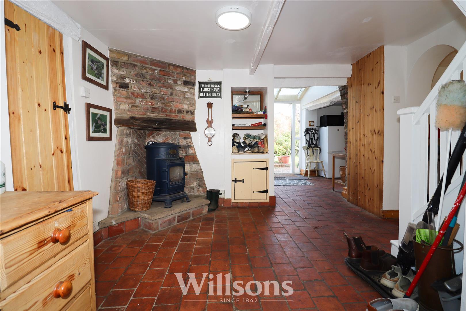 With feature corner fireplace and hearth, shelving alcoves, under-stairs storage cupboard and quarry tile flooring.