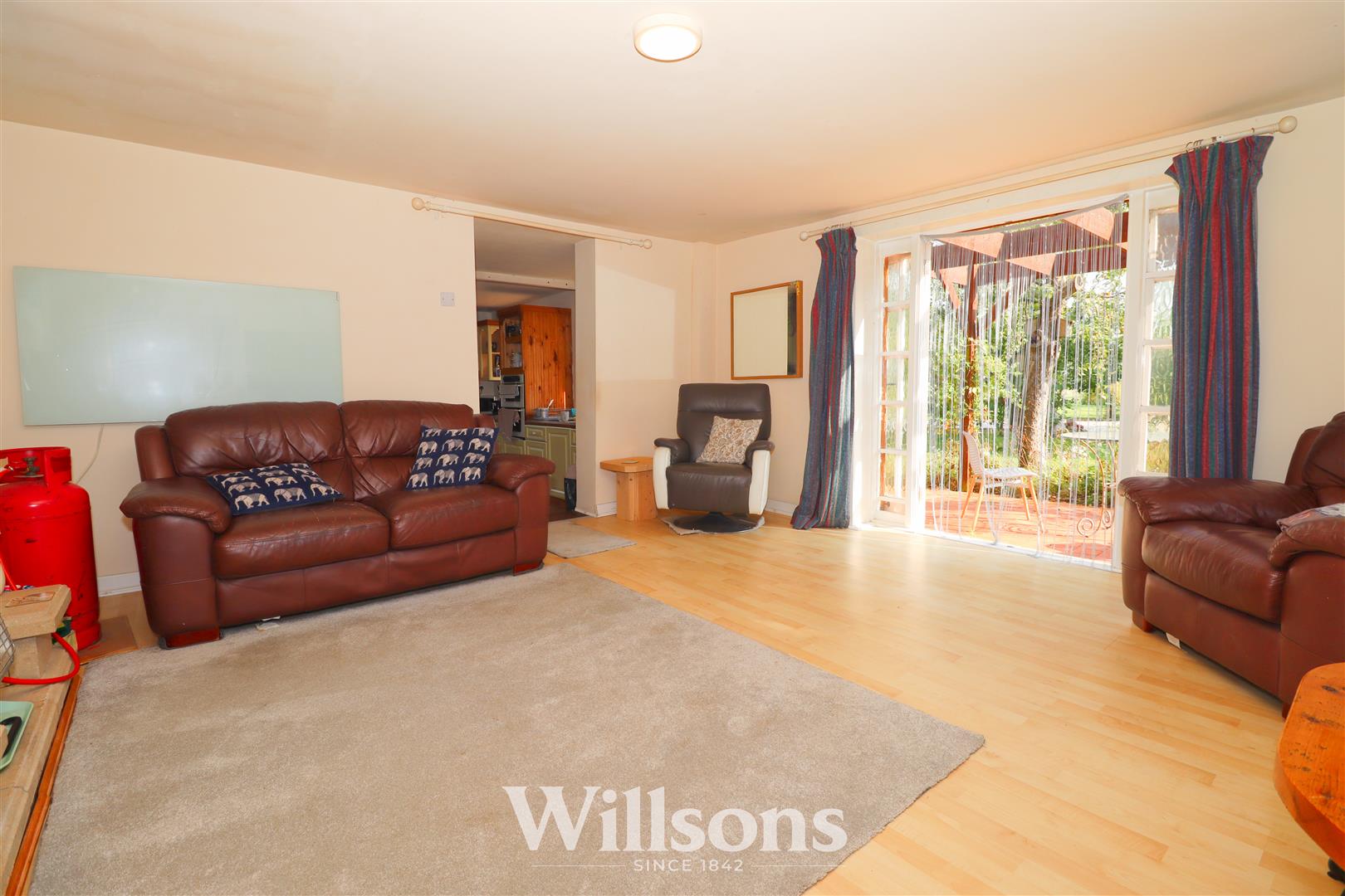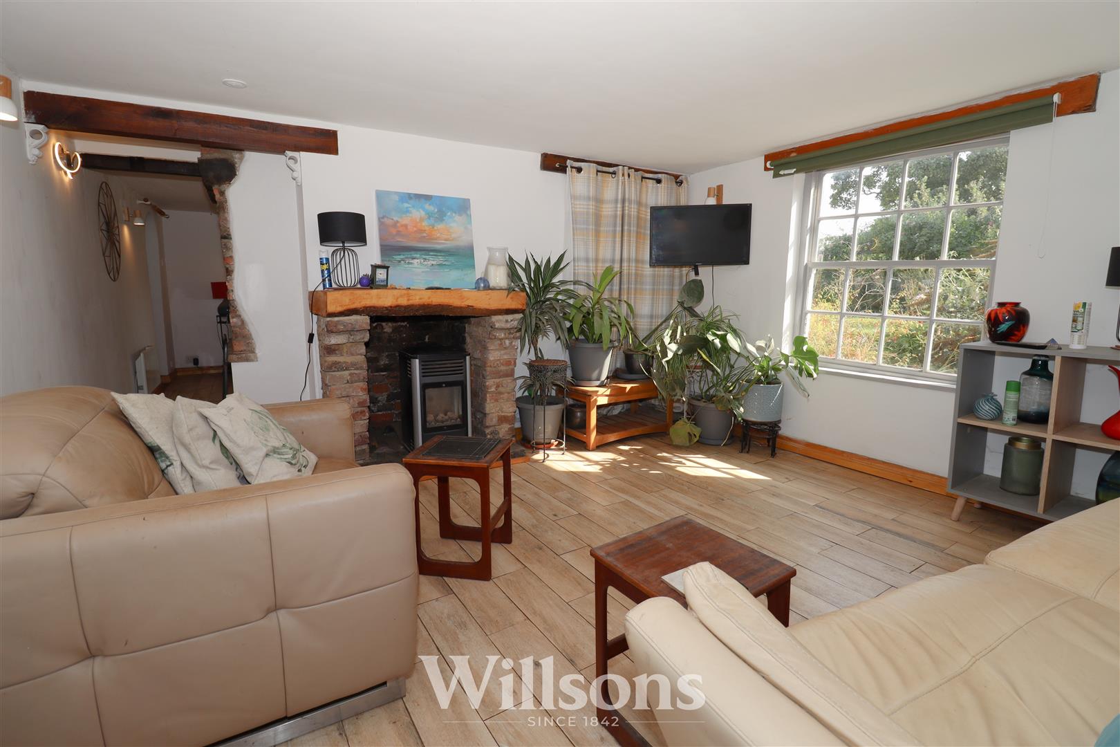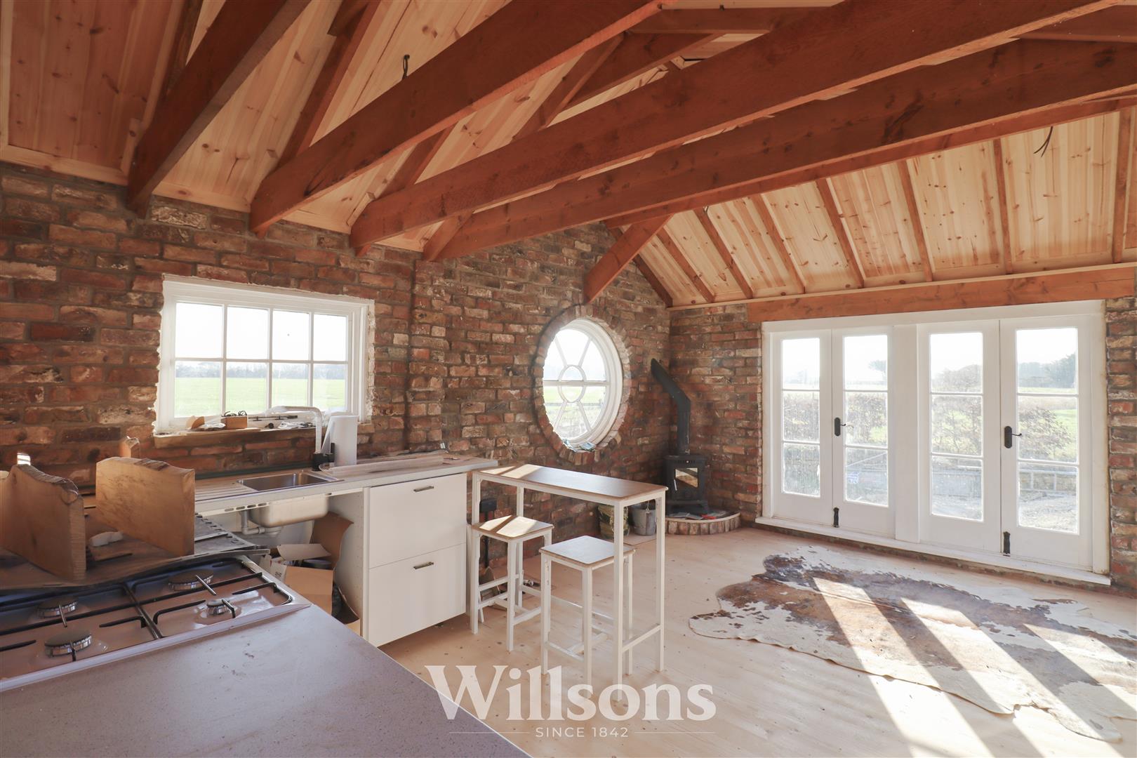 Triple aspect room with newly installed kitchen consisting of a range of base units, stainless steel sink with drainer and mixer tap, space for free standing electric cooker, space for slimline under counter fridge, log burner with hearth, wooden flooring, feature circular window and additional window with views over open fields, double French doors to the side and full height window to the front.