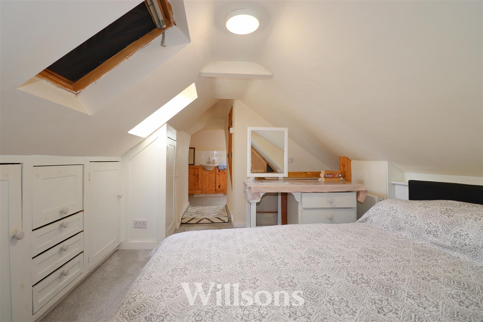 With fully vaulted ceilings, built-in storage cupboards, two wooden Velux windows and carpeted flooring.