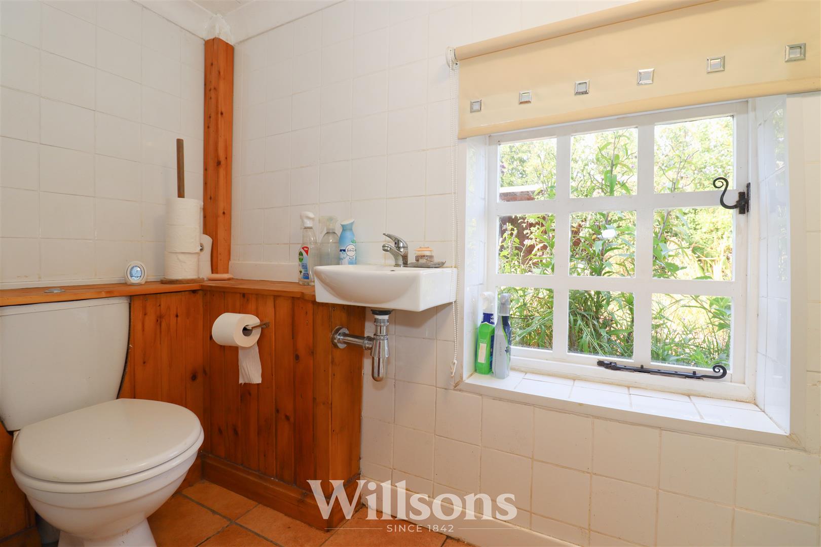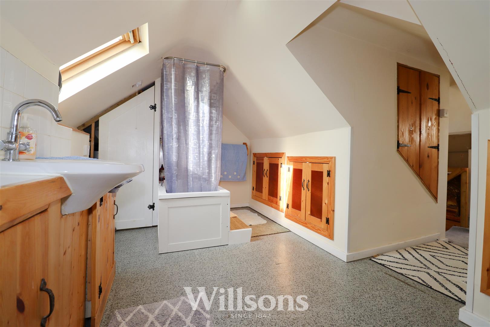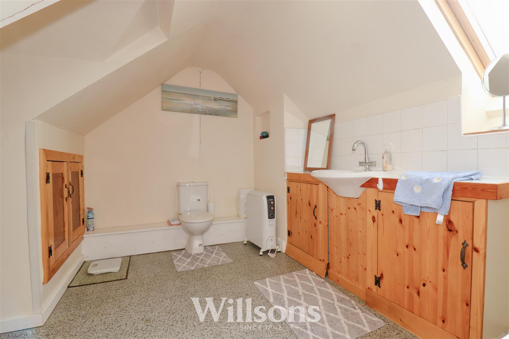 With WC, wash basin, central roll-top bath, built-in storage cupboard housing the immersion tank, window to the front of the property and tiled flooring.