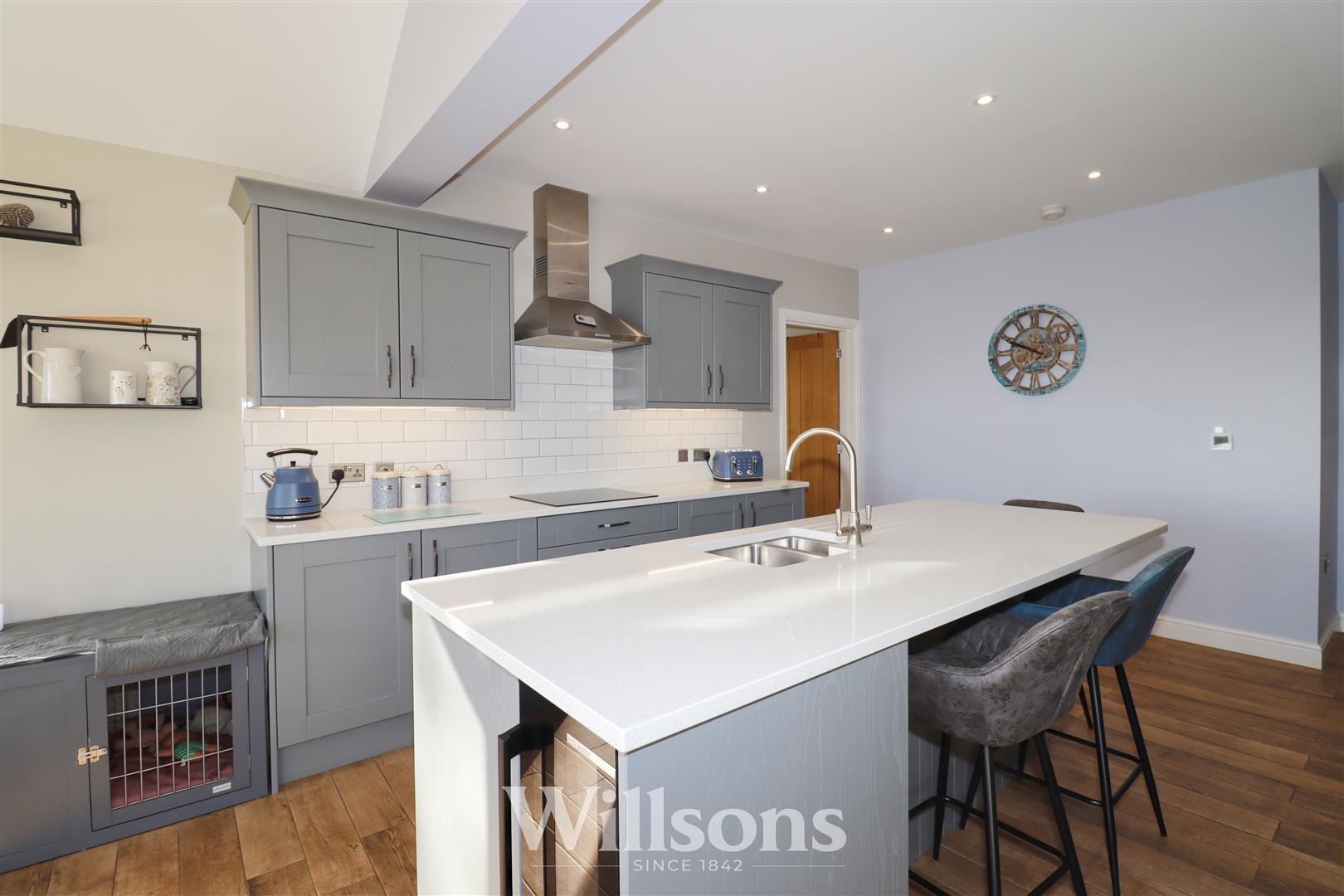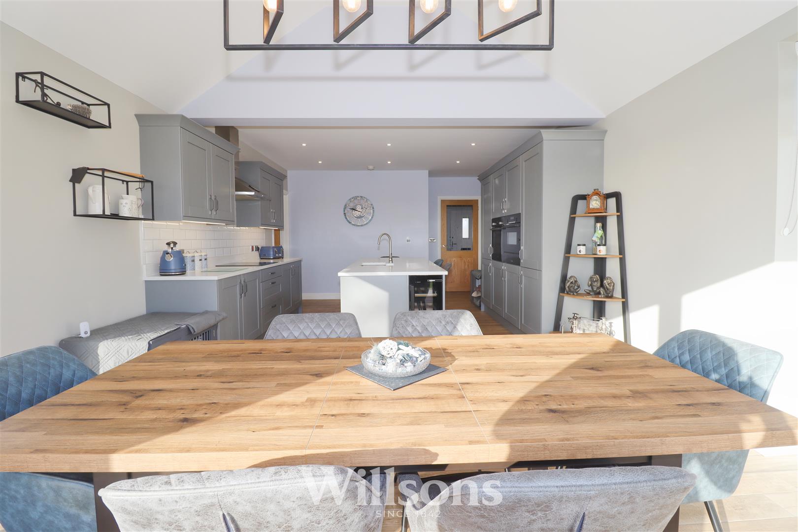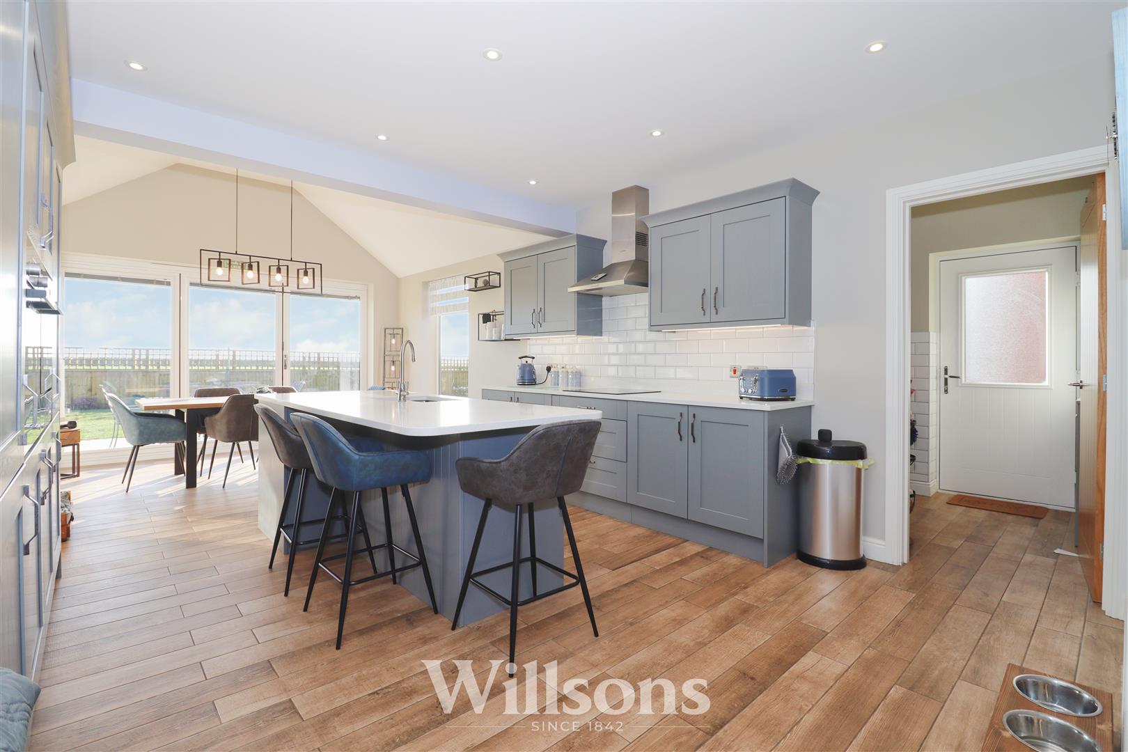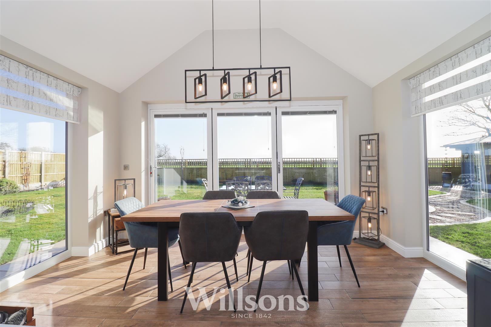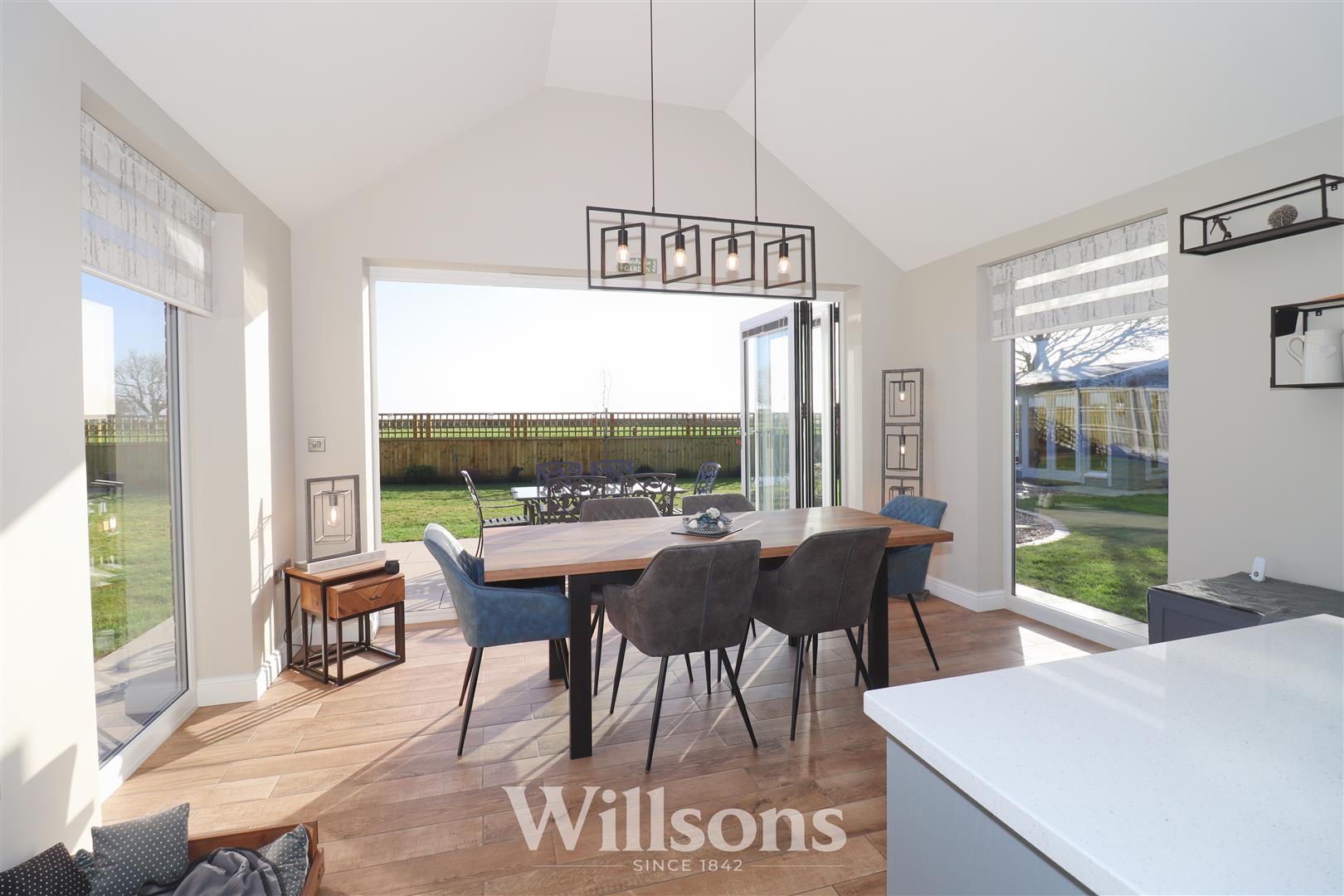 A wonderful light and bright space with vaulted ceilings to the apex and full height triple aspects with bi-fold doors spanning the full width leading onto the patio terrace with extensive views over open fields beyond. The kitchen offers ample storage with a stylish range of wall and base units complimented by marble sparkle worktops and corresponding upstands, Bosch ceramic hob with stainless steel extractor fan over, wide utensil and pan draws below and tiled splashback. The central free-standing island with corresponding worktop incorporates a breakfast bar, with stainless steel sink with 1.5 bowls and mixer tap, integrated Bosch dishwasher and wine refrigerator and integrated four compartment waste disposal drawer. This modern kitchen offers a further full height wall of fitted storage cupboards with integrated eye-level Bosch double ovens and full height 60/40 split fridge freezer. With partially tiled walls, downlighting and dining space with central pendant lighting this modern dining kitchen with practical wood-grain effect tiled flooring is the heart of the home and with full-span bi-fold doors invites with outside space right into the home!