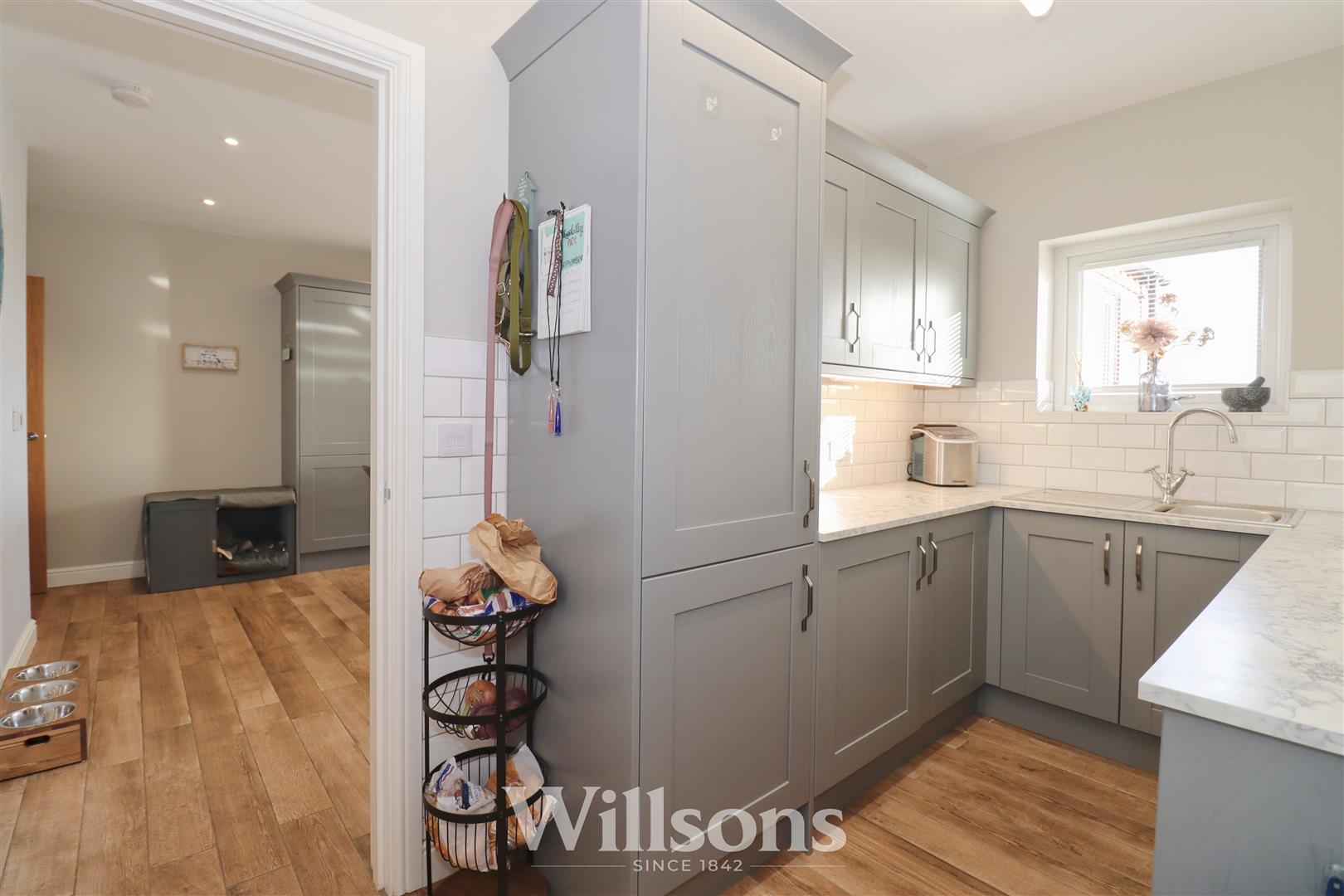 Utility room situated adjacent to the kitchen with a range of wall and base units which correspond with the main kitchen, with marble effect worktop and under unit lighting, full height larder storage unit, stainless steel sink with mixer tap and draining board, tiled splashback, space and plumbing for integrated washing machine, extractor fan, tiled wood grain effect flooring continued from the kitchen, high level window and partially glazed composite rear door to the garden.