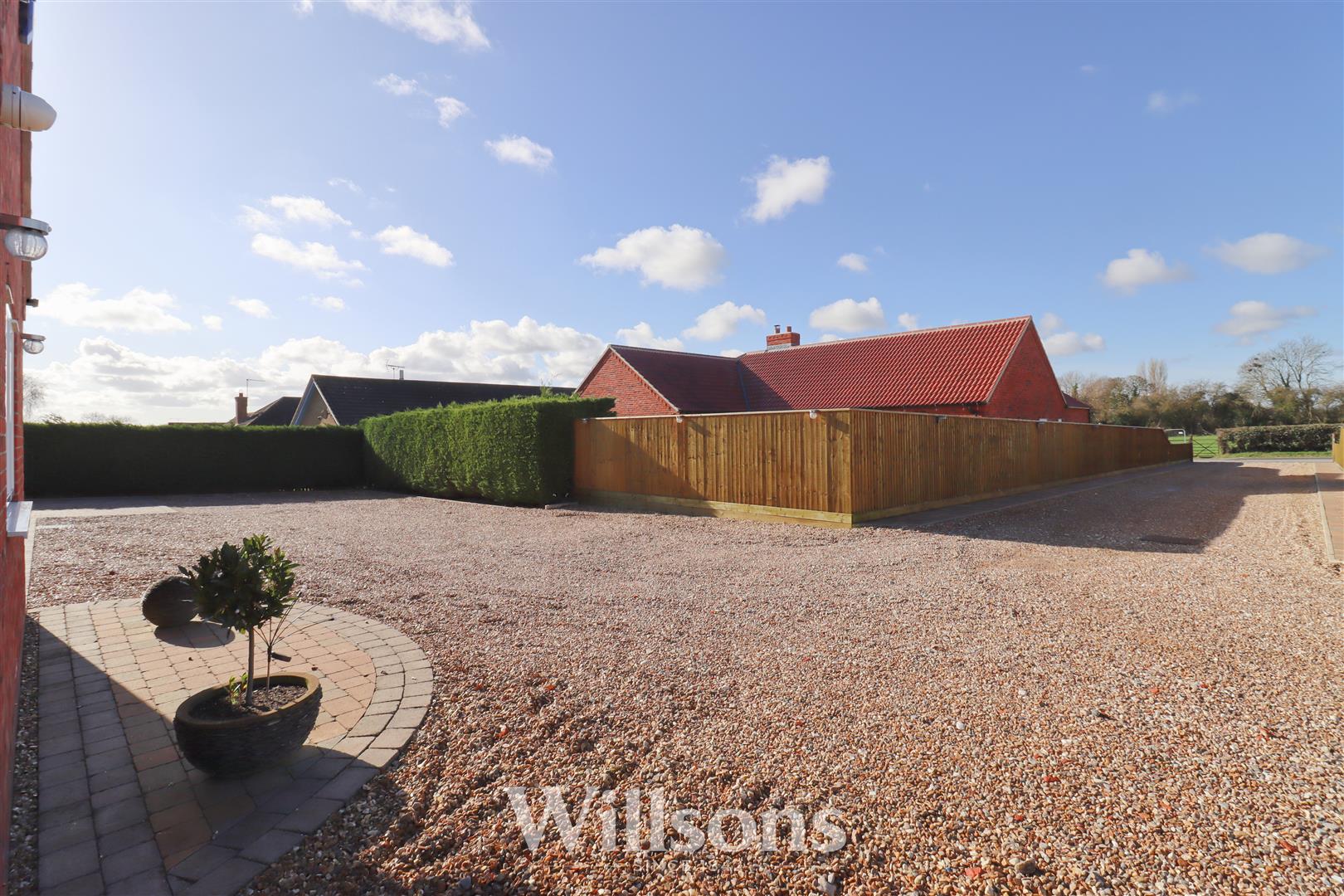 Situated back from the roadway down a long gravel driveway with block paving pathway leading to a wide area of gravelled parking. With attractive block paving apron to the front of the double garage extending across the front of the property and leading to a composite entrance door, the property benefits from external lighting, CCTV, wall mounted property intruder alarm, wooden pedestrian gates to either side and boundaries of hedging and fencing.