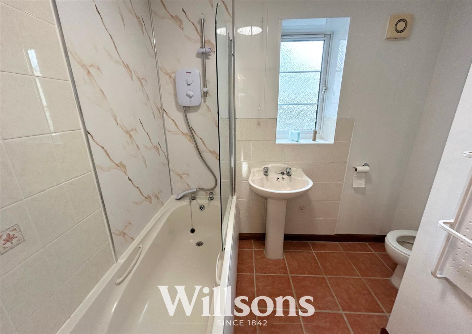 Window, Heated towel rail, Electric shower with bath and tiled splashback, Toilet, Sink, Mirror, Extractor fan, Light.