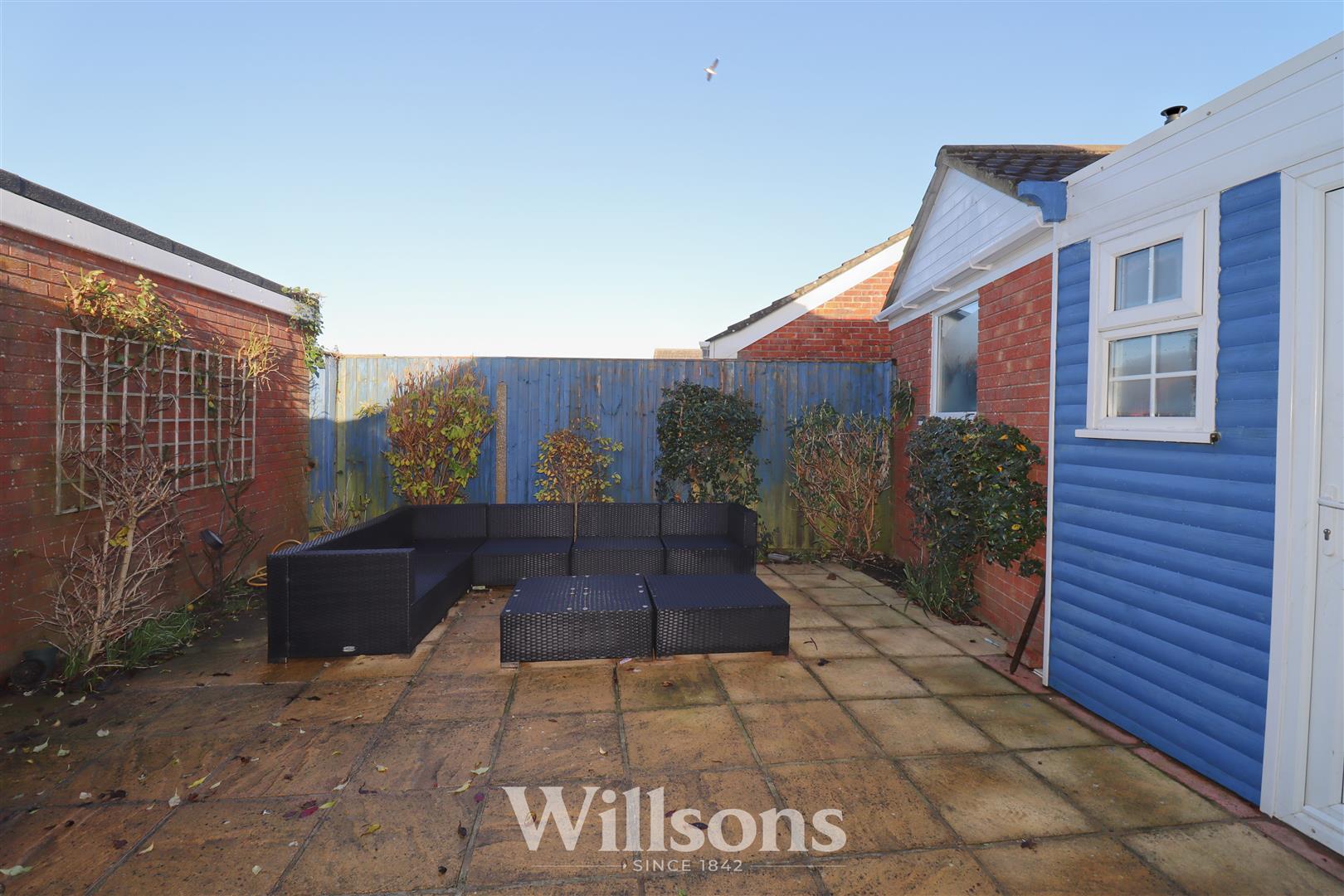 Low maintenance north facing, set to concrete slabs and block paving with mature shrubs, external lighting and power and boundaries of fencing and brick wall.