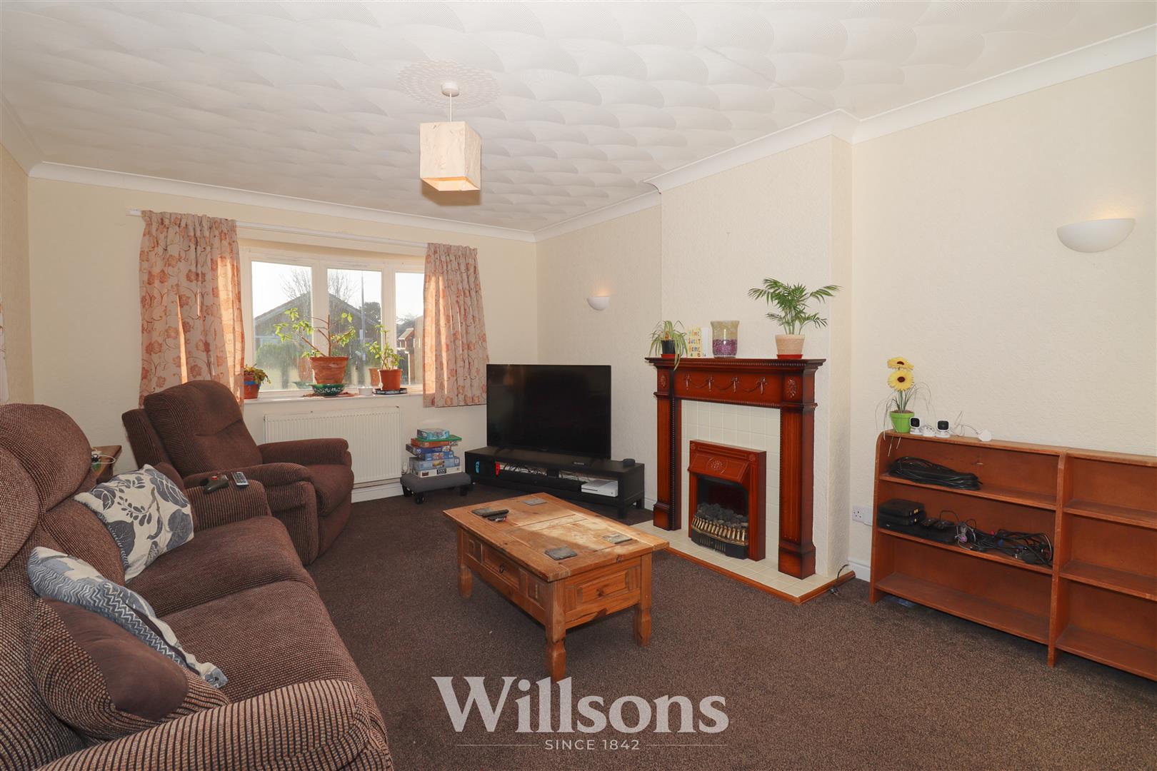 Dual aspect room with central chimney breast wall with mantle and electric fire, radiator, wall lighting, carpeted flooring and bow windows to the front and side of the property.