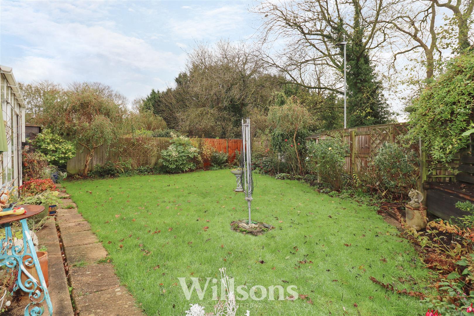 South-facing rear garden with no overlook set to lawns with borders of mature flowers and plants, concrete slab patio, concrete pathways to either side of the property leading to gated access to the right hand side of the garage, wooden garden shed, external tap and enclosed boundaries of fencing.