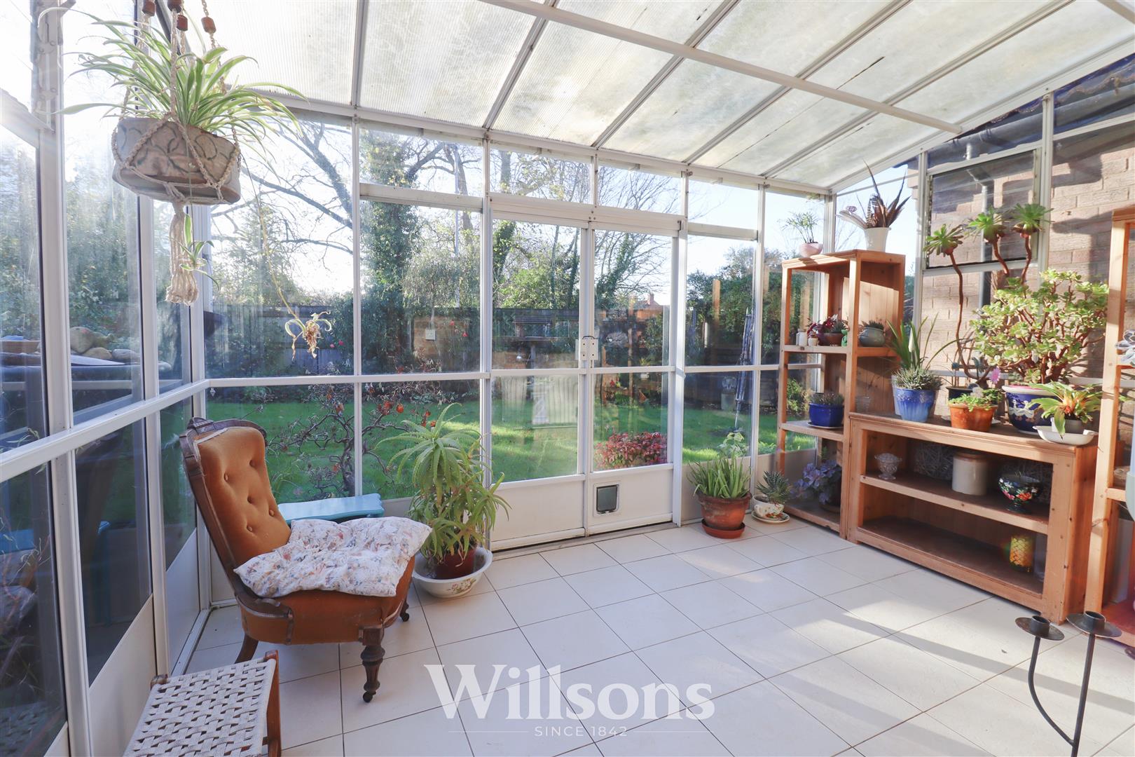 Metal framed greenhouse style lean-to sun room with full single glazed panes and polycarbonate style roof with sliding patio doors to the rear garden, radiator, tiled flooring, wooden internal window to the dining room and wooden partially glazed internal door to the kitchen.