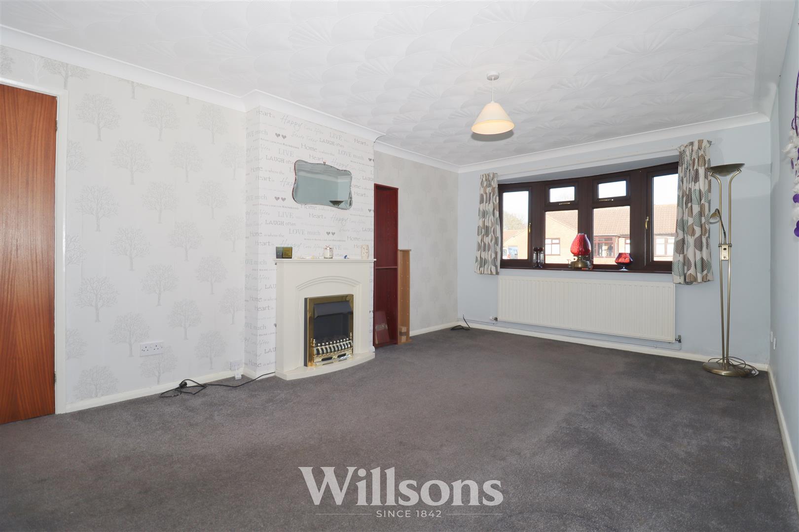 Dual aspect room with central chimney breast wall with electric fire, hearth and mantle, radiator, carpeted flooring, feature bay window to the front of the property and further window to the side.