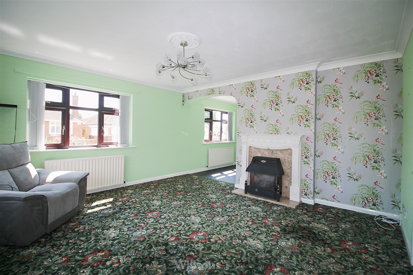 With carpeted flooring, marble surround fireplace and gas faire, bay window to the front and window to the side of the property.
