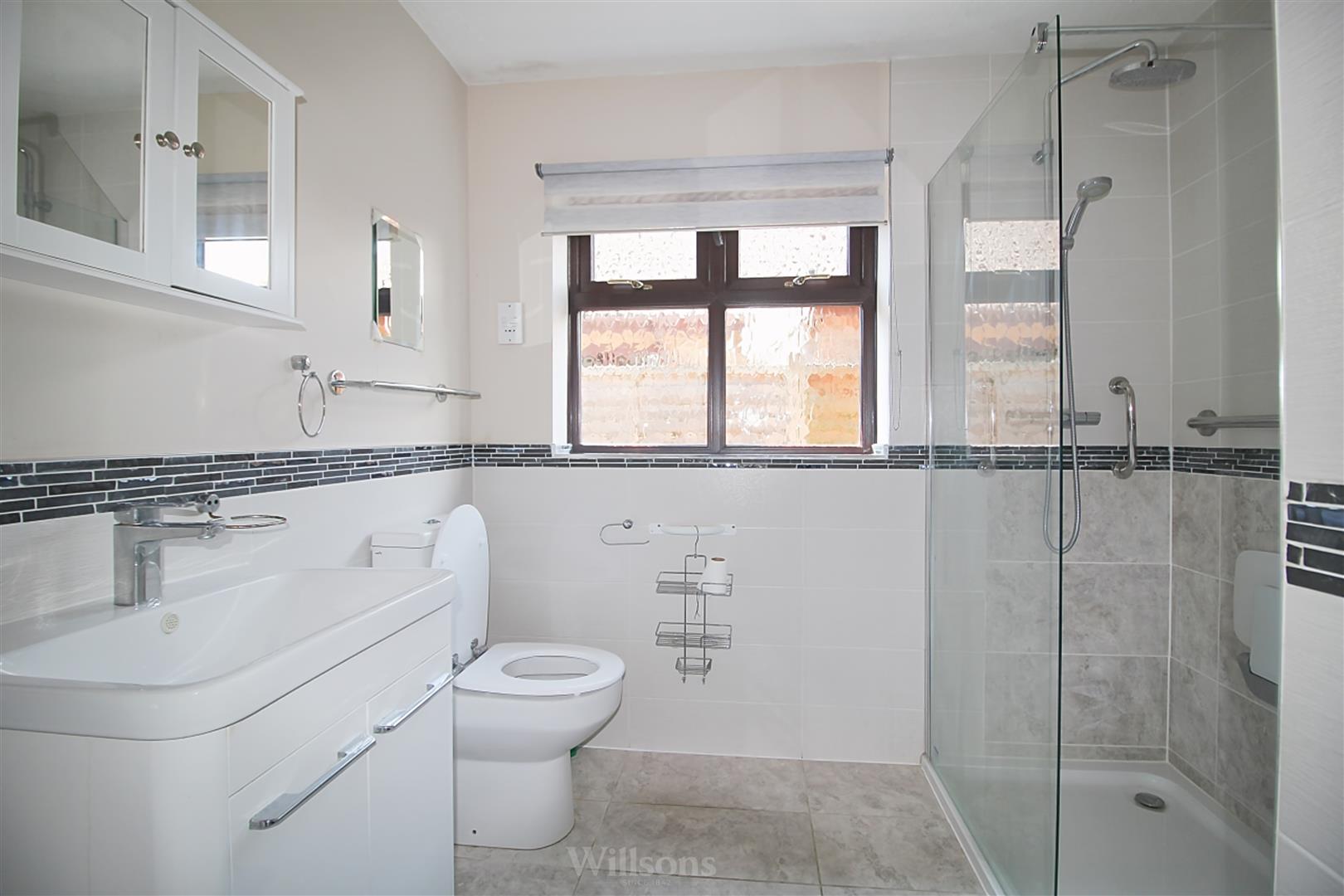 With enclosed low level shower tray having direct feed shower over, part tiled walls, tiled flooring, WC and sink vanity unit, airing cupboard and window to the rear of the property.