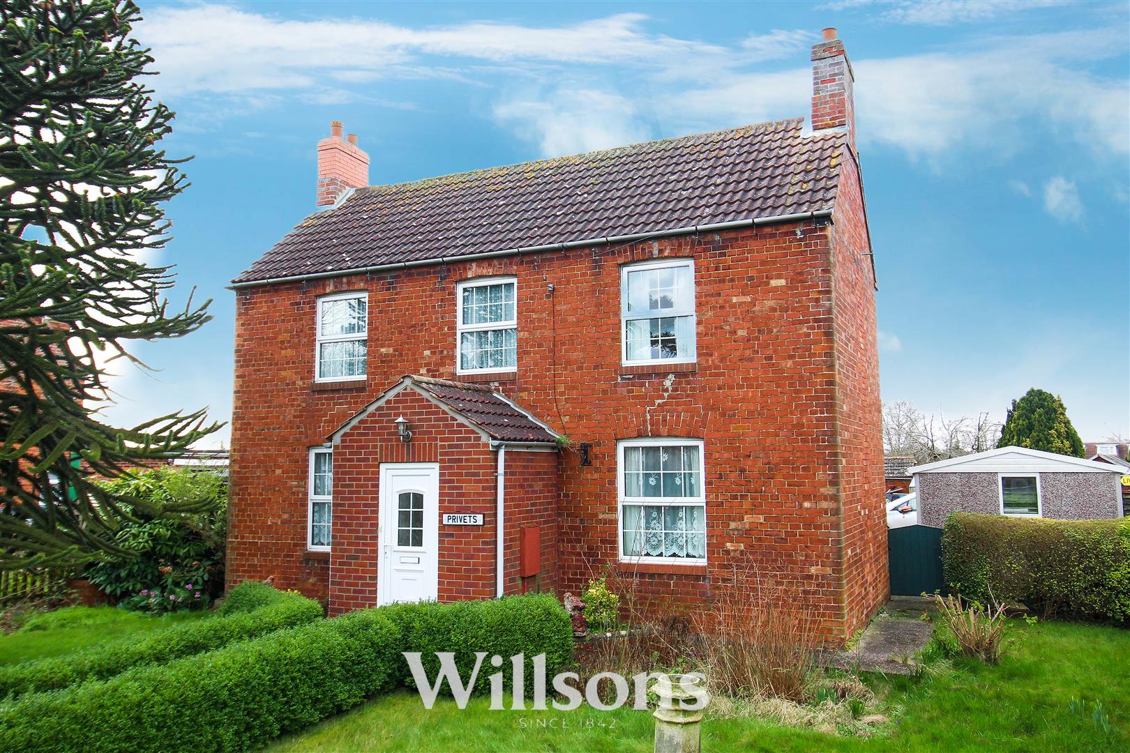 The property sits on a corner position with gardens to the front, sides and rear. Vehicular access is gained to the rear of the property via a wooden 5 bar gate with matching hand gate opening onto the gravelled drive and parking area leading to the