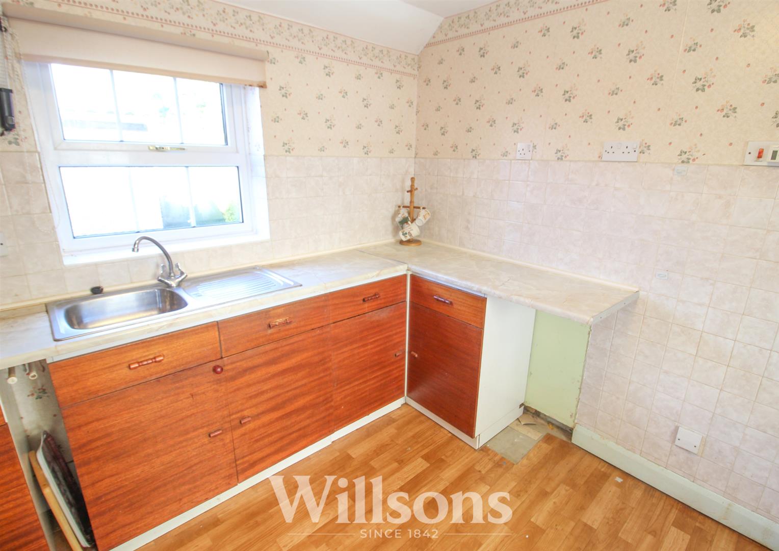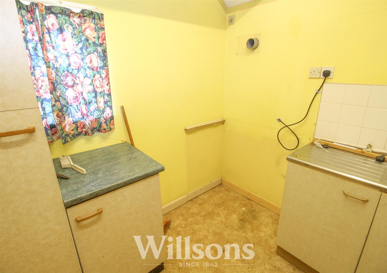Having base and larder units with worksurface over incorporating stainless steel single drainer sink. Plumbing for washing machine, Upvc double glazed window and full height hand built twin doored storage cupboard.