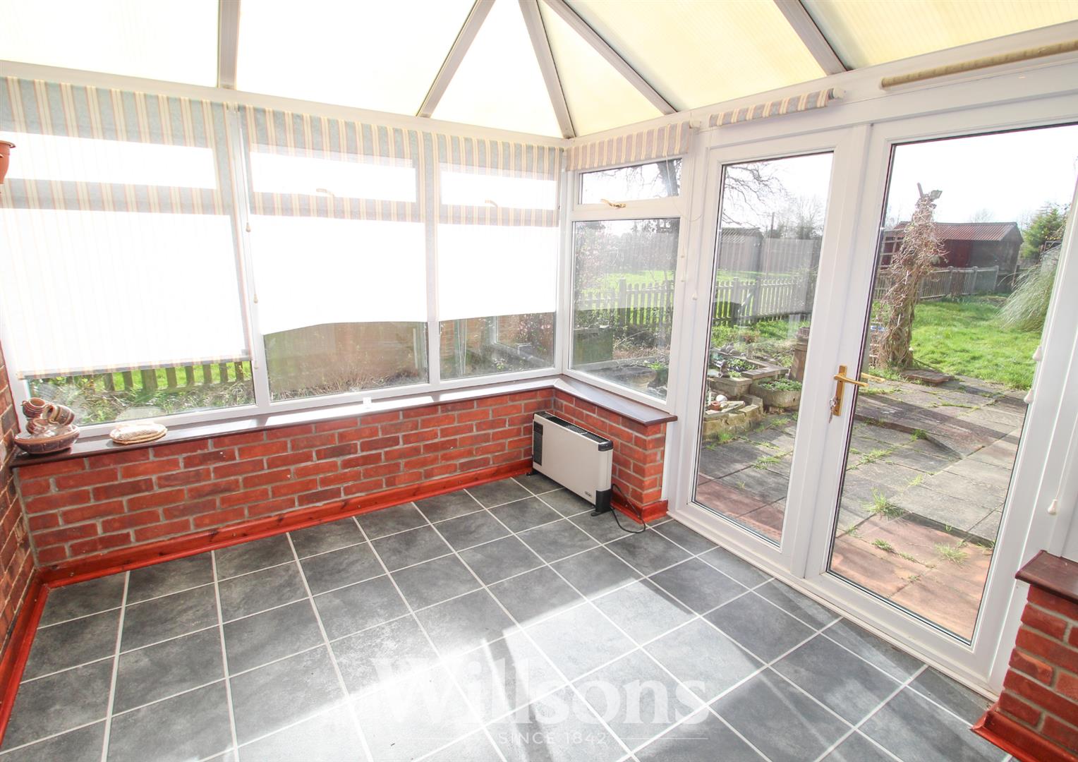 Being of UPVC double glazed construction on a brick base to two sides under a pitched polycarbonate roof, radiator and a pair of Upvc double glazed patio doors open onto the rear garden.