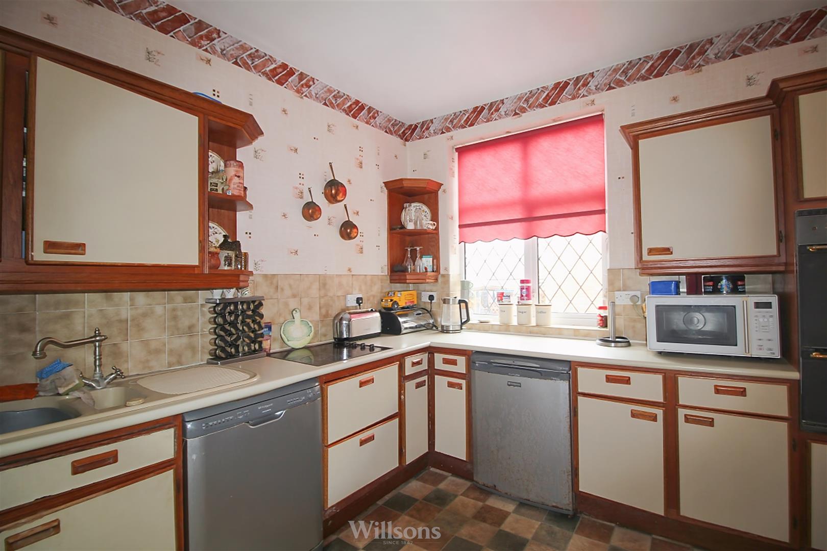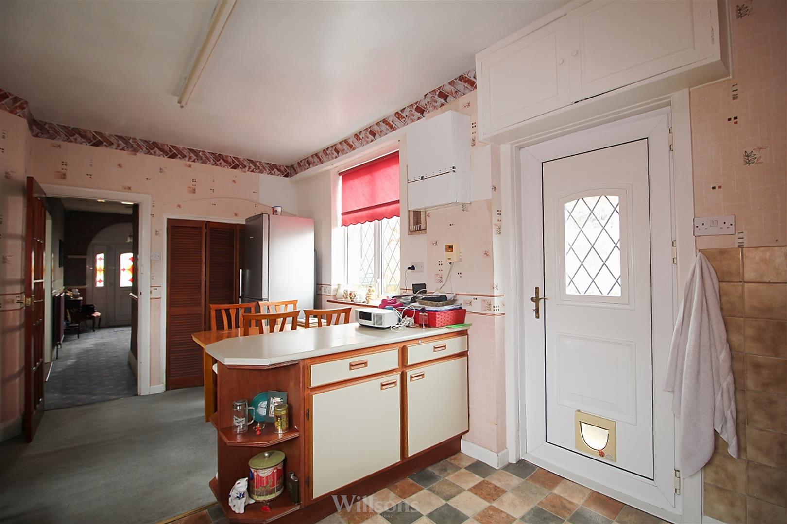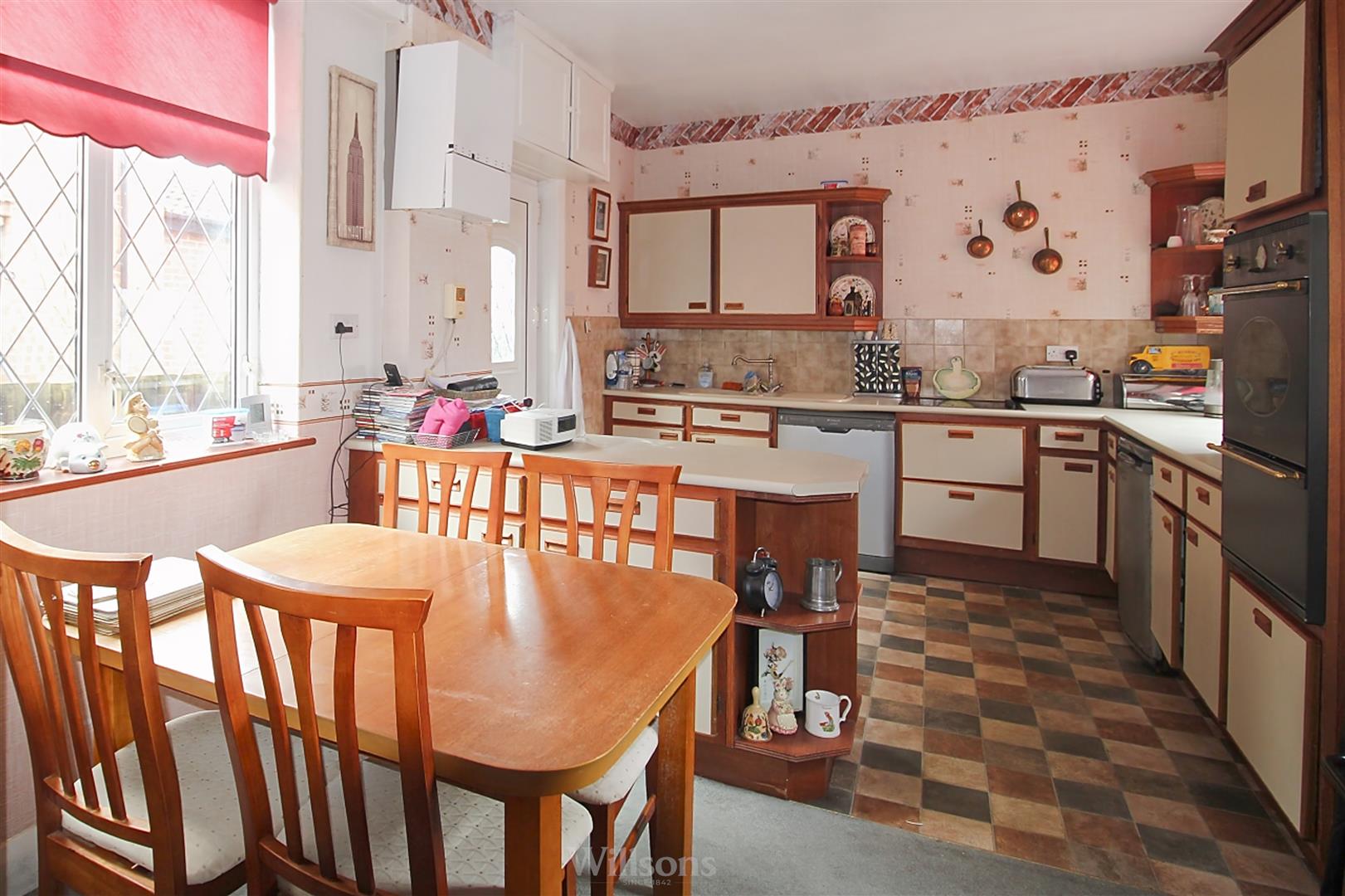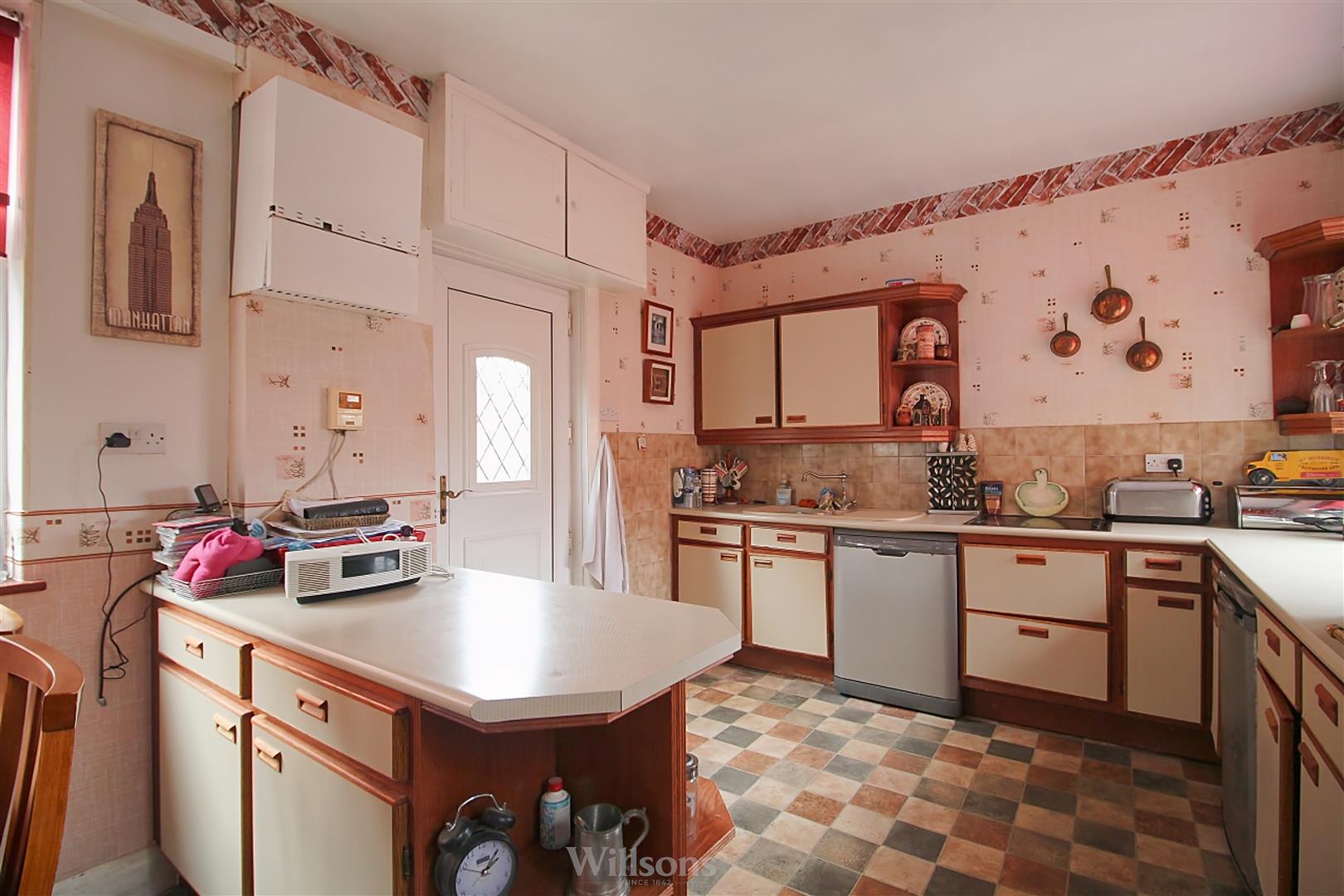 With a range of base and wall units, tiled splashbacks, double electric oven, ceramic hob, space and plumbing for dishwasher, wall mounted gas boiler, vinyl flooring to the kitchen area, carpeted flooring to the dining area, door to the side of the property and dual windows to each side of the property.