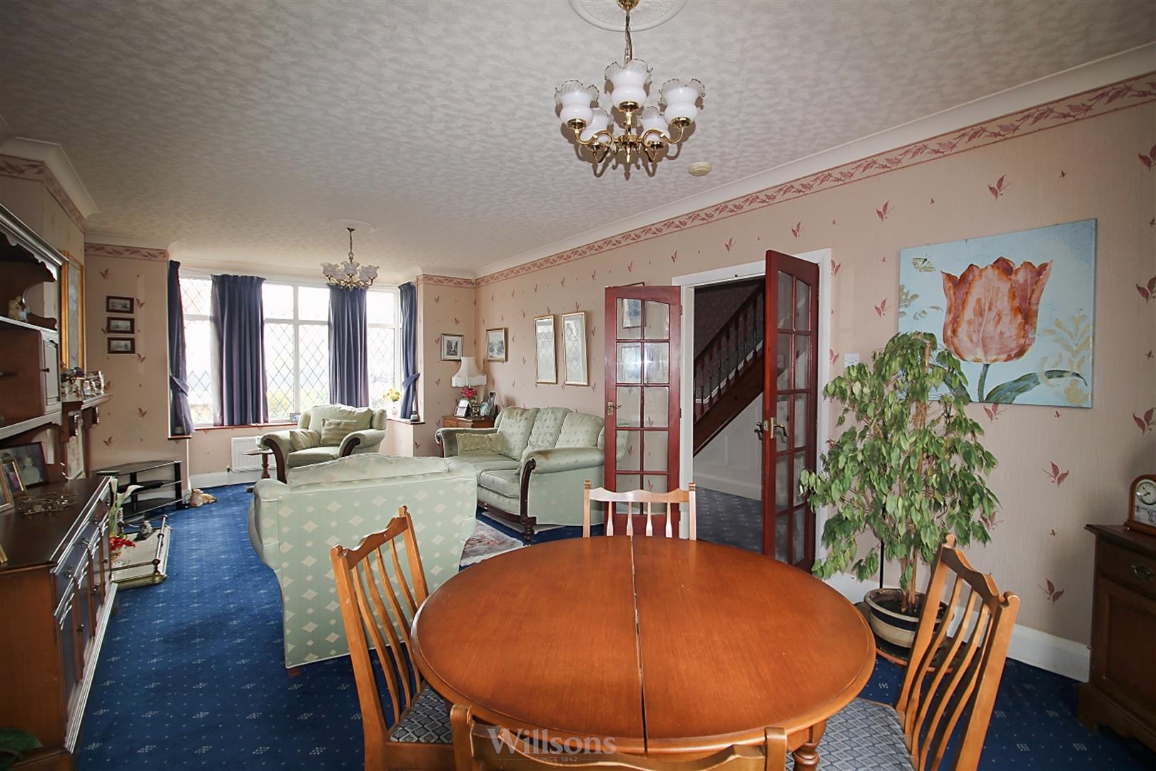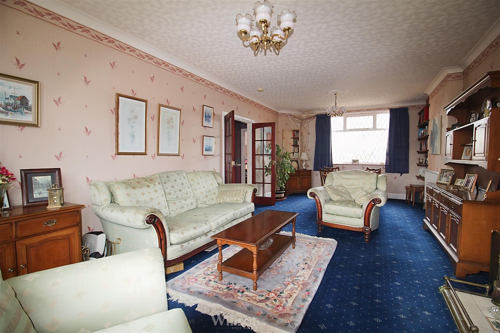 With single glazed and timber double doors from the hallway, wooden surround fire place with gas fire, carpeted flooring, bay window to the front and window to the rear of the property.