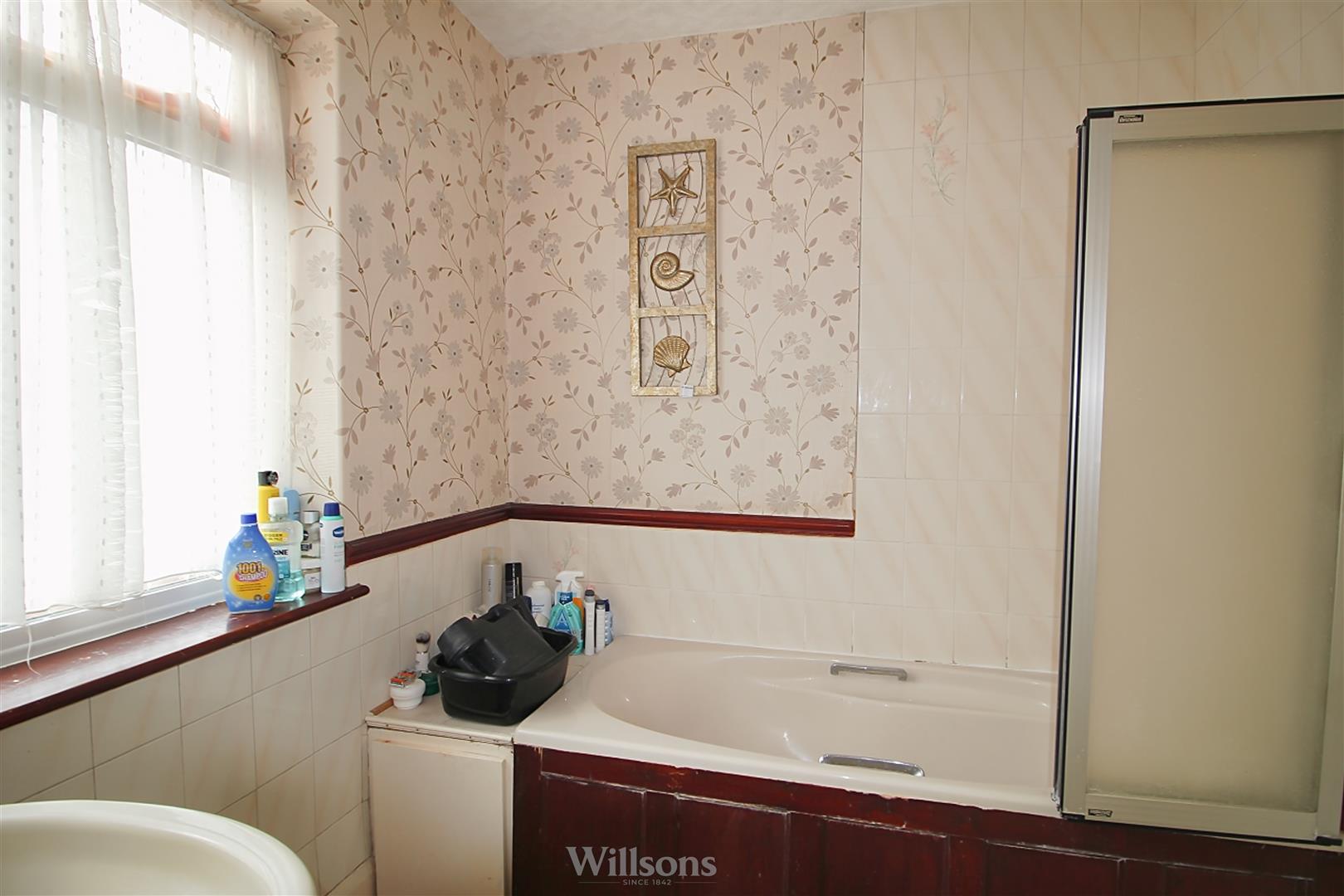With sink, bath having electric shower over, airing cupboard, carpeted flooring and window to the side of the property.