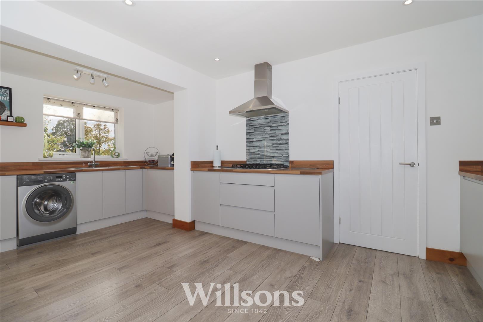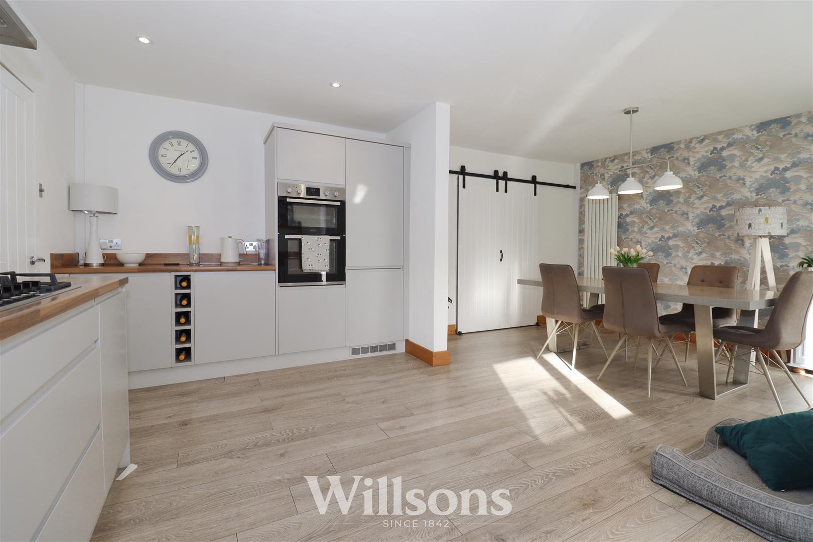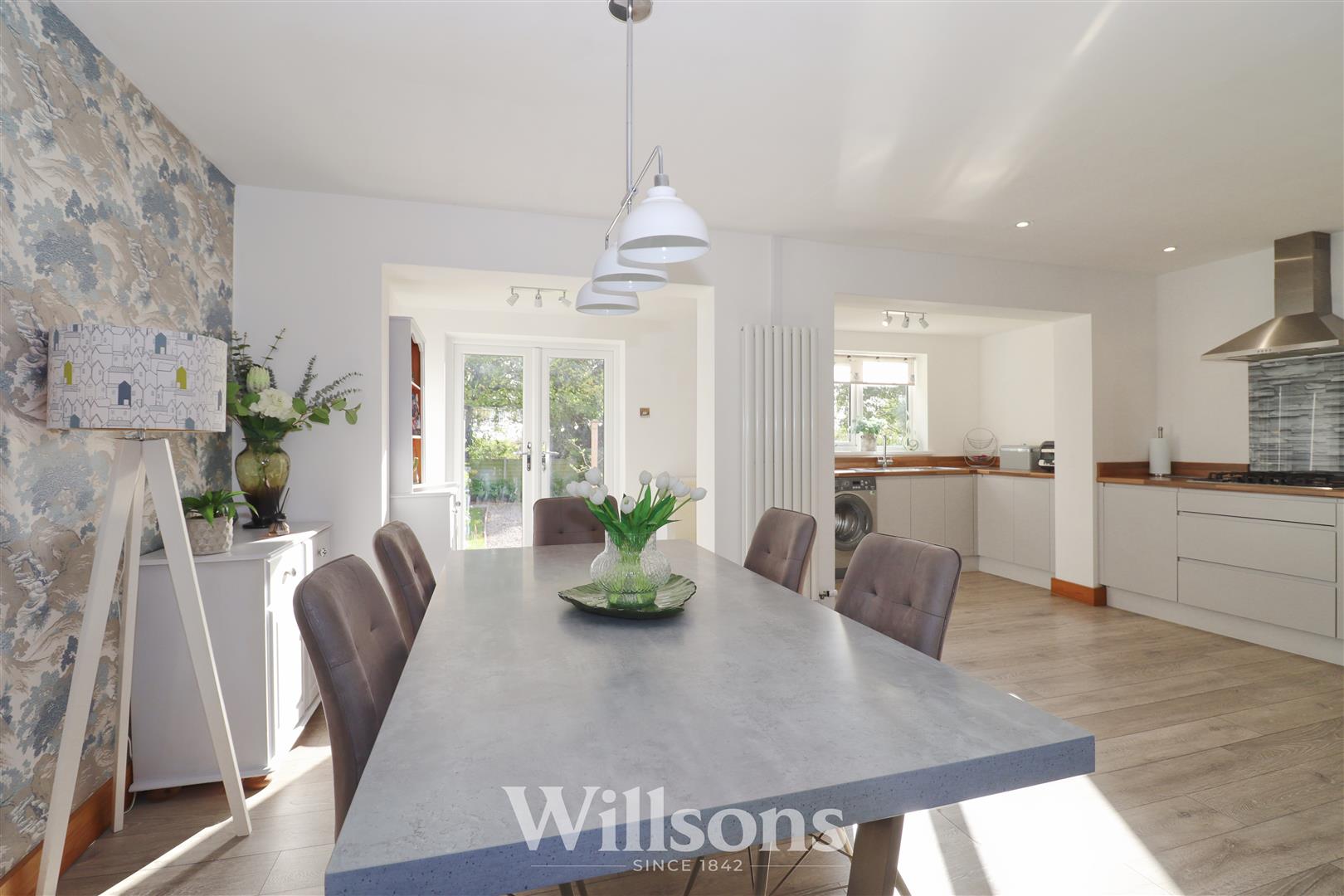 Stylish and recently installed, spacious dining kitchen with range of base units, five burner gas hob with extractor over and feature glass splash back, integrated Zanussi eye level double oven and grill, integrated 70/30 fridge freezer, sink with 1.5 bowls, mixer tap and drainer, worktop with matching upstands and chrome sockets, integral wine rack, wide pan and implement draws, space and plumbing for washing machine, two vertical radiators, feature pendant lighting and recessed downlighting, woodgrain LVT flooring, French doors and window to the rear patio and garden, sliding doors to the living room to form a great dual aspect, open plan space.