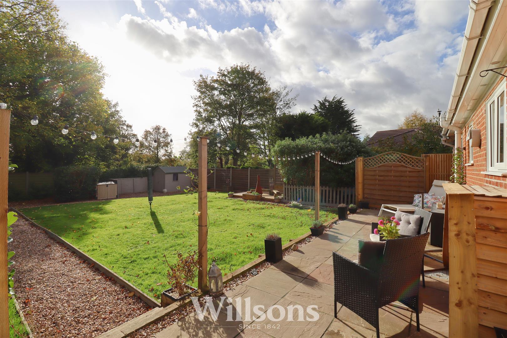 South facing private rear garden with terraced Indian sandstone paving slab patio, set primarily to lawn with feature gravel pathways, raised garden beds, mature bushes and shrubs, area of decking, stepping stones, wooden garden shed with concealed storage area to the rear, external tap and lighting, pedestrian gate to the left with concrete pathway and boundaries of fencing.