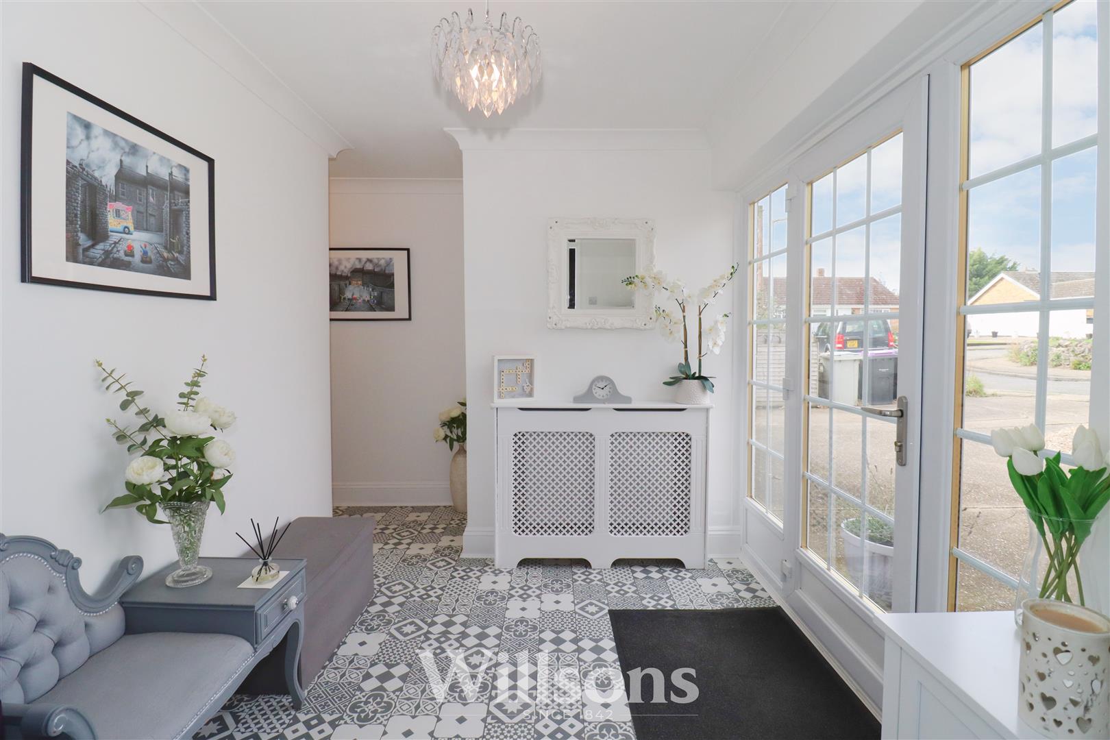With uPVC fully glazed front door with Georgian bar detail and glazed panels to either side, radiator with decorative cover and Victorian patterned LVT click flooring leading to further internal hallway with loft access and full height storage cupboard (0.7m x 0.4m) with louvered door.