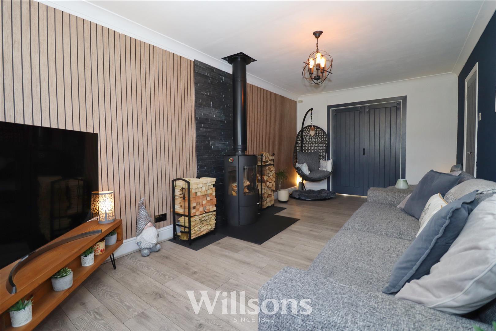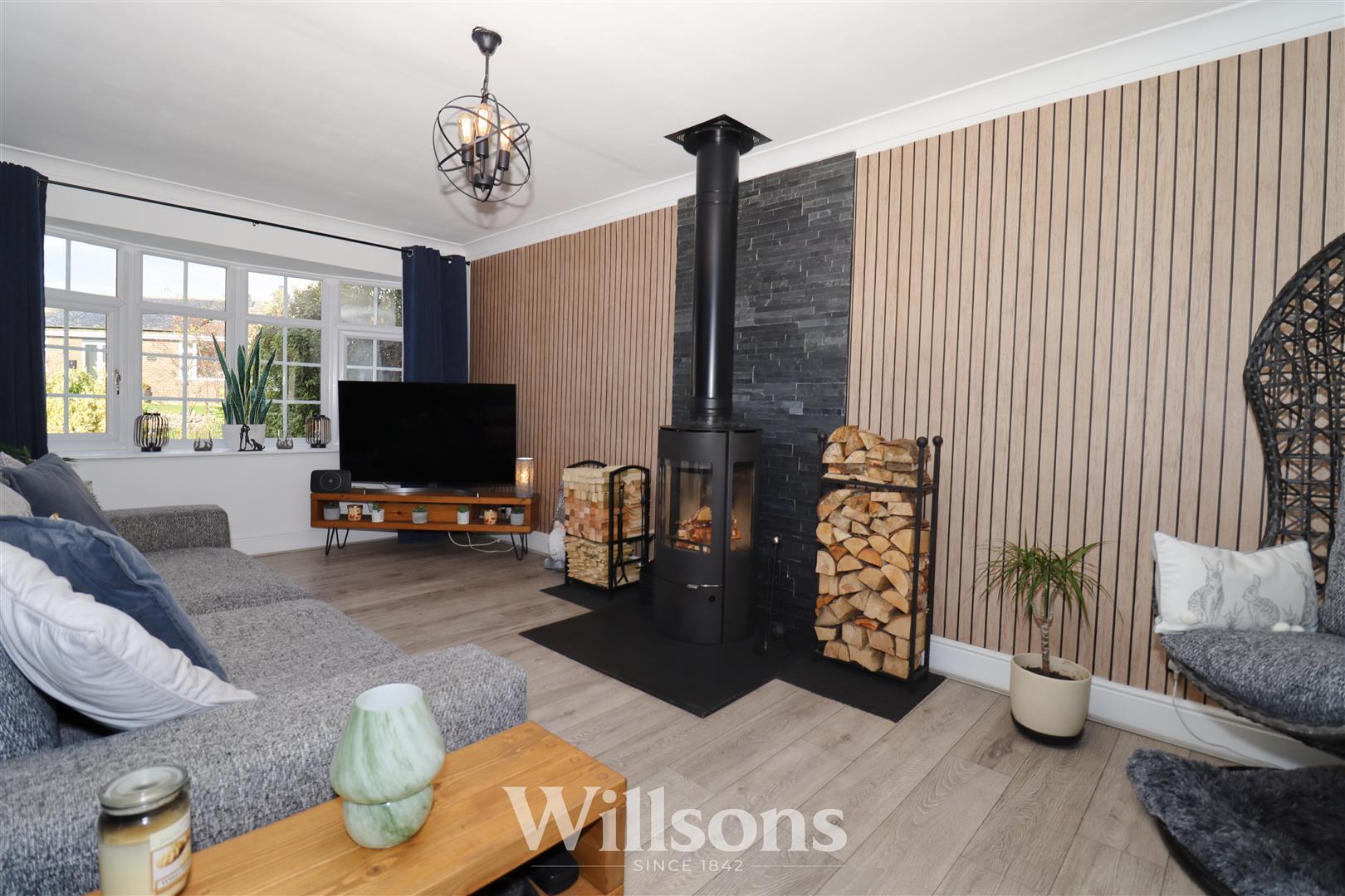With centre focus freestanding wood burning stove in front of tiled wall cladding and hearth, vertical radiator, chrome sockets and switches, woodgrain LVT flooring, sliding door to the kitchen and feature bay window with views over the front garden.