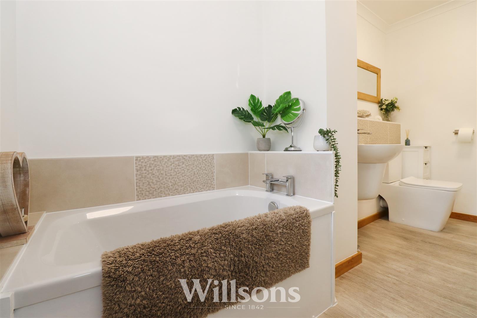 With wall mounted wash basin, WC, glazed shower enclosure with rainfall shower and low level entry, compact size bath, heated towel radiator, partially tiled walls, extractor fan, woodgrain LVT flooring, and window with obscure glazing to the rear.