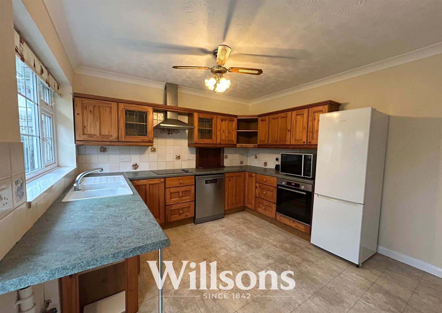 Window, radiator, range of wall and base units, integrated oven and hob, overhead extractor, free standing fridge freezer, free standing dishwasher, sink with drainer, space and plumbing for washing machine, light, sockets and switches.