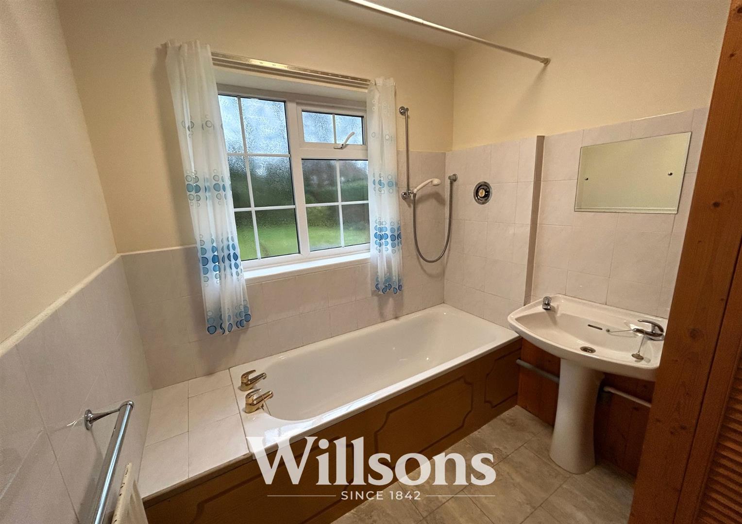 Window, radiator, pedestal sink, bath with overhead mains shower, airing cupboard with gas boiler, light and pull cord switch