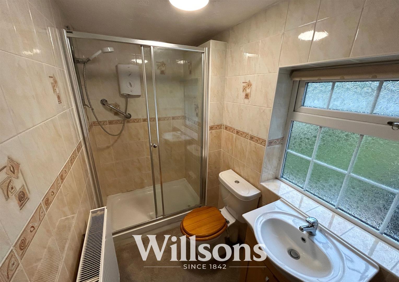 Accessed through bedroom 1. Window, radiator, vanity unit with sink, free standing toilet, shower cubicle with electric shower, light and switch