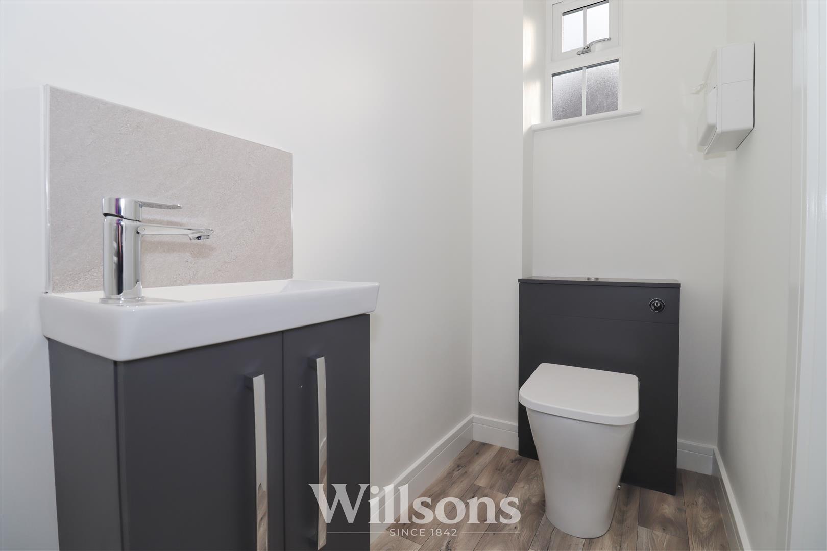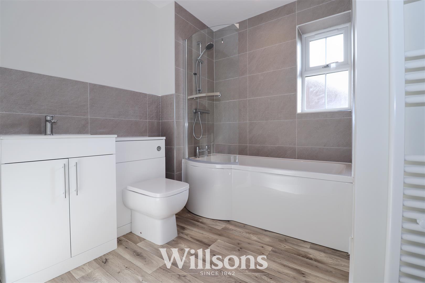 Comprising concealed cistern WC unit, washbasin vanity unit with mixer tap, tiled splashback and storage below, heated towel radiator, downlighting, extractor fan, property fuse box, high-level window with obscure glazing and vinyl flooring.