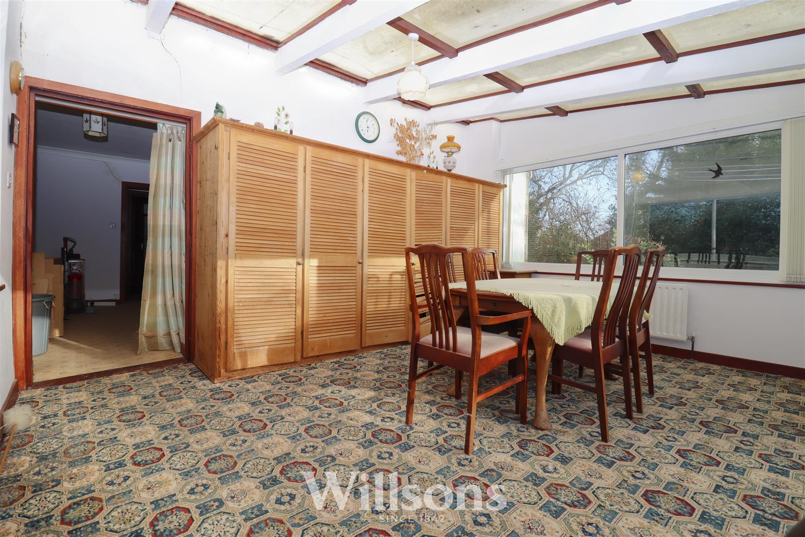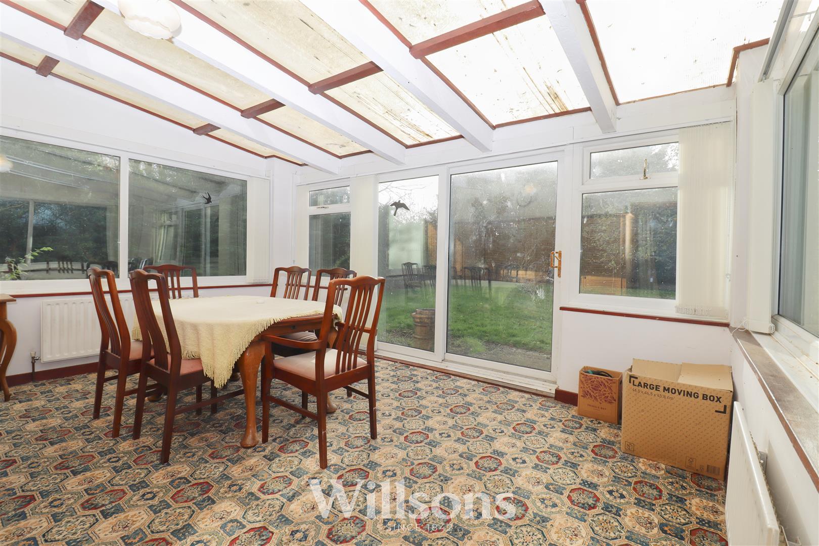 Access via a concrete ramped entrance from the garden to the sliding patio door, this sun room is of dwarf brick wall and uPVC construction with polycarbonate style roof, windows to three sides with aspects over the wraparound gardens has two radiators, built-in storage cupboards and carpeted floor.