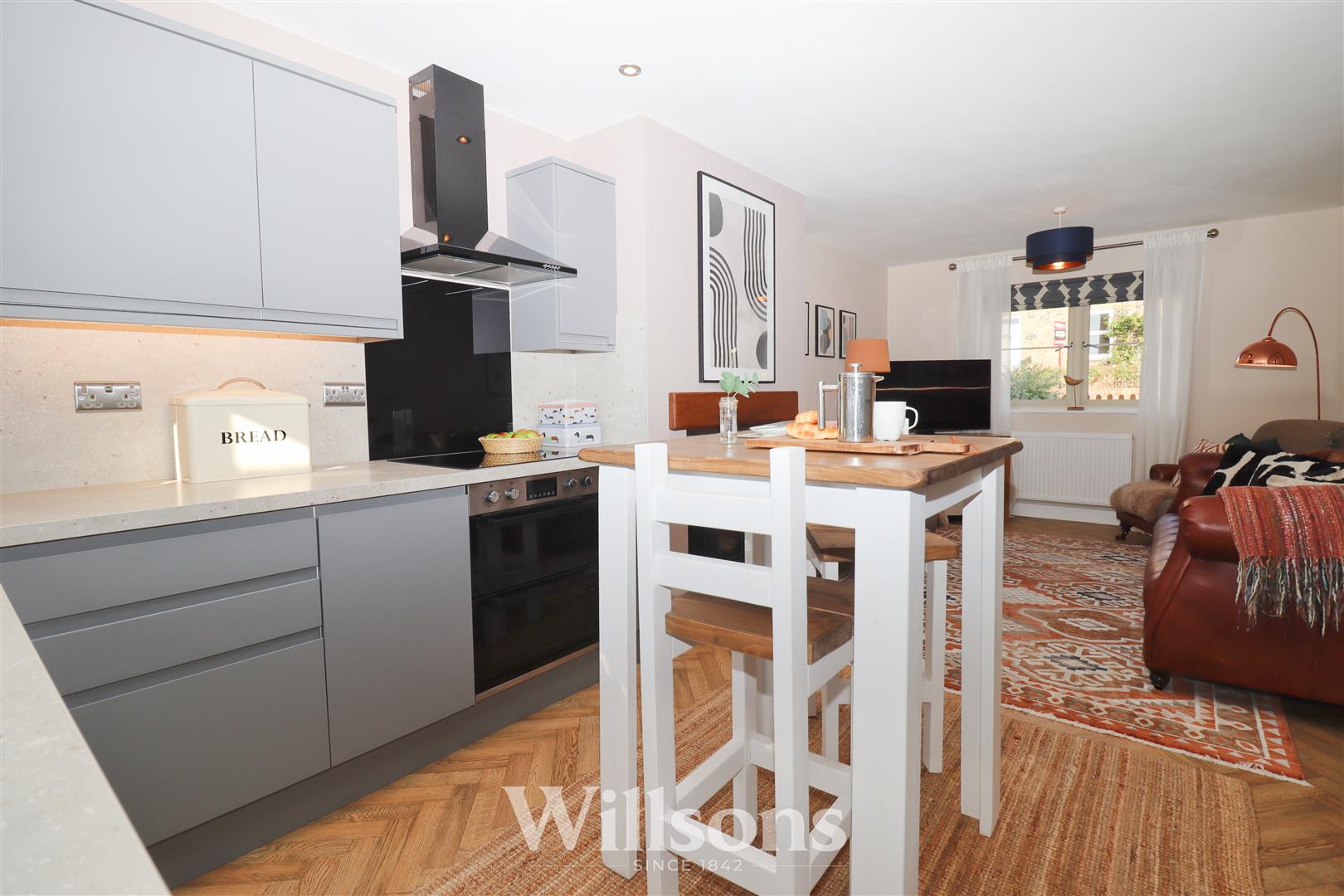 Dual aspect living kichen with a range of wall and base units, integrated oven and grill with ceramic hob, glass splashback and extractor hood over, sink with drainer and mixer tap, integrated fridge and freezer, integral washing machine, corresponding worktop and splashback, Viessman gas combination boiler, chrome finish sockets, chimney breast wall with gas log effect burner on slate hearth with wooden mantle, radiator, room thermostat, vinyl flooring, recessed downlighting and windows with aspects over the gardens to the front and rear.