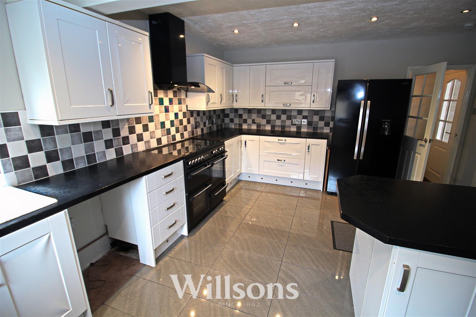 Attractively designed on a monochrome theme with white gloss wall and base units, black worksurfaces with inset enamel white sink with mixer tap, Leisure Range oven with gas hob and ovens with cooker hood over, splash-back tiling, American style fridge freezer, breakfast bar with integrated wine chiller, space and plumbing for dishwasher, radiator, tiled floor, under unit lighting and kickboard lighting, Upvc double glazed door to side, 2 Upvc double glazed windows, inset ceiling spotlights.